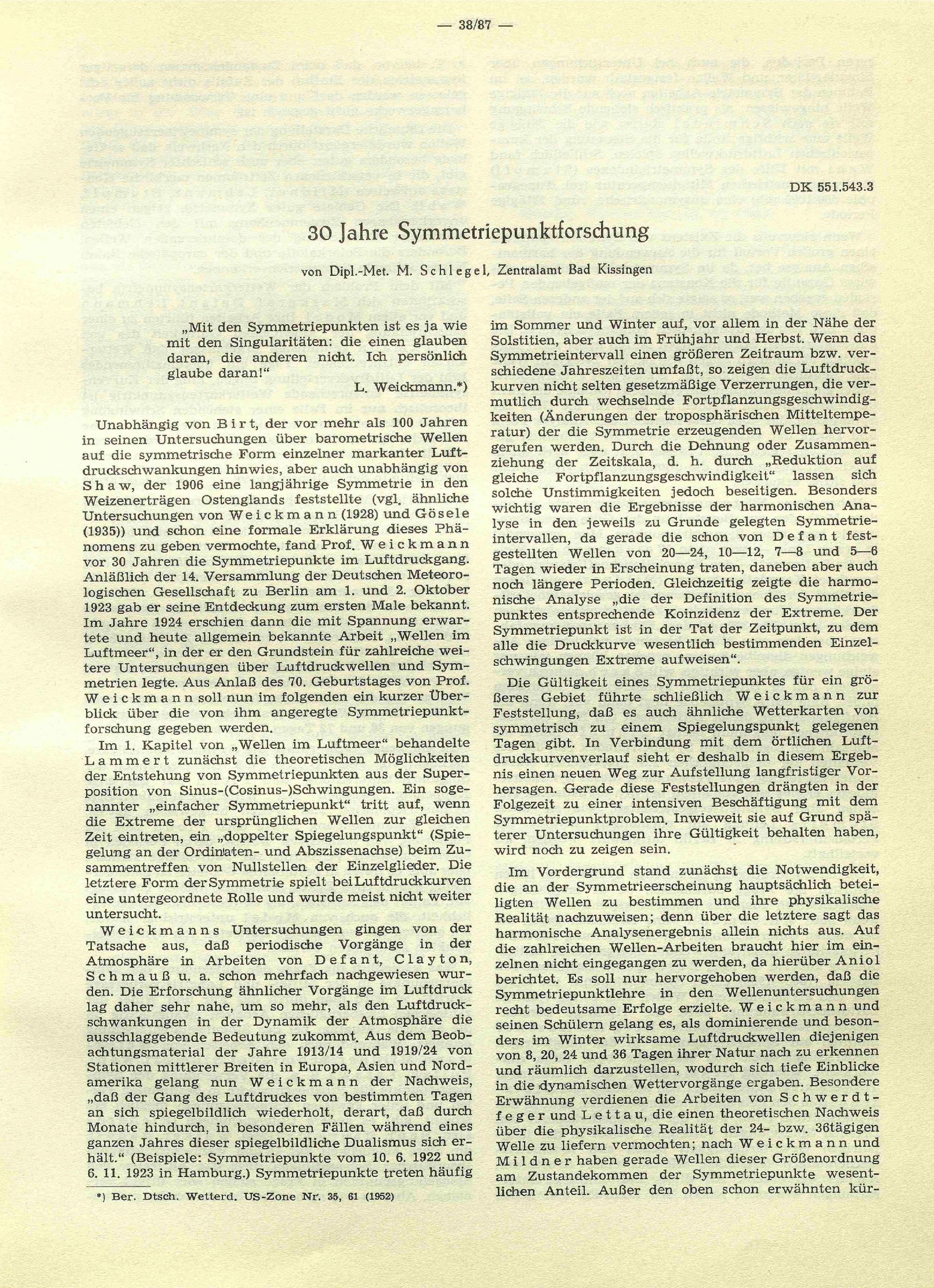 Weickmann-Heft : [Herrn Professor Dr. Ludwig Weickmann zum 70. Geburtstage am 15. August 1952 gewidmet von seinen Mitarbeitern, Schülern und Freunden] / Deutscher Wetterdienst in der US-Zone