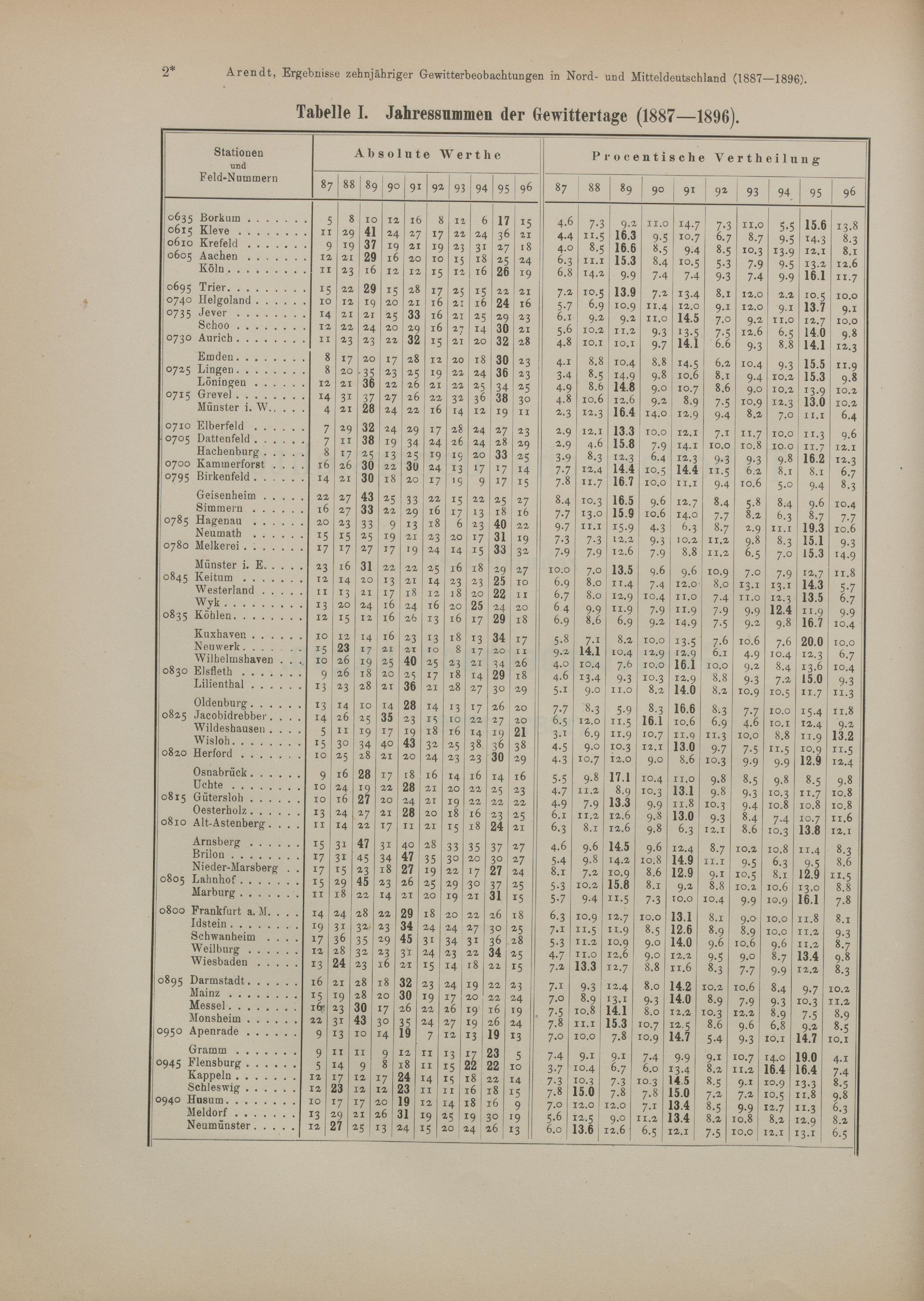 Tabellarische Übersichten zehnjähriger Gewitterbeobachtungen (1887-1896)