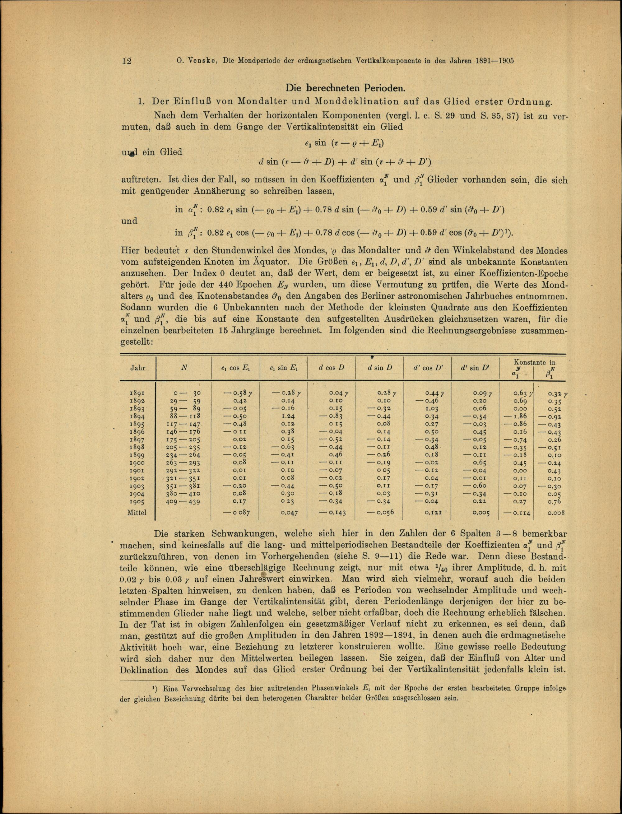 Die Mondperiode der erdmagnetischen Vertikalkomponente nach den Registrierungen des Potsdamer Magnetographen in den Jahren 1891 - 1905 / Oswald Venske
