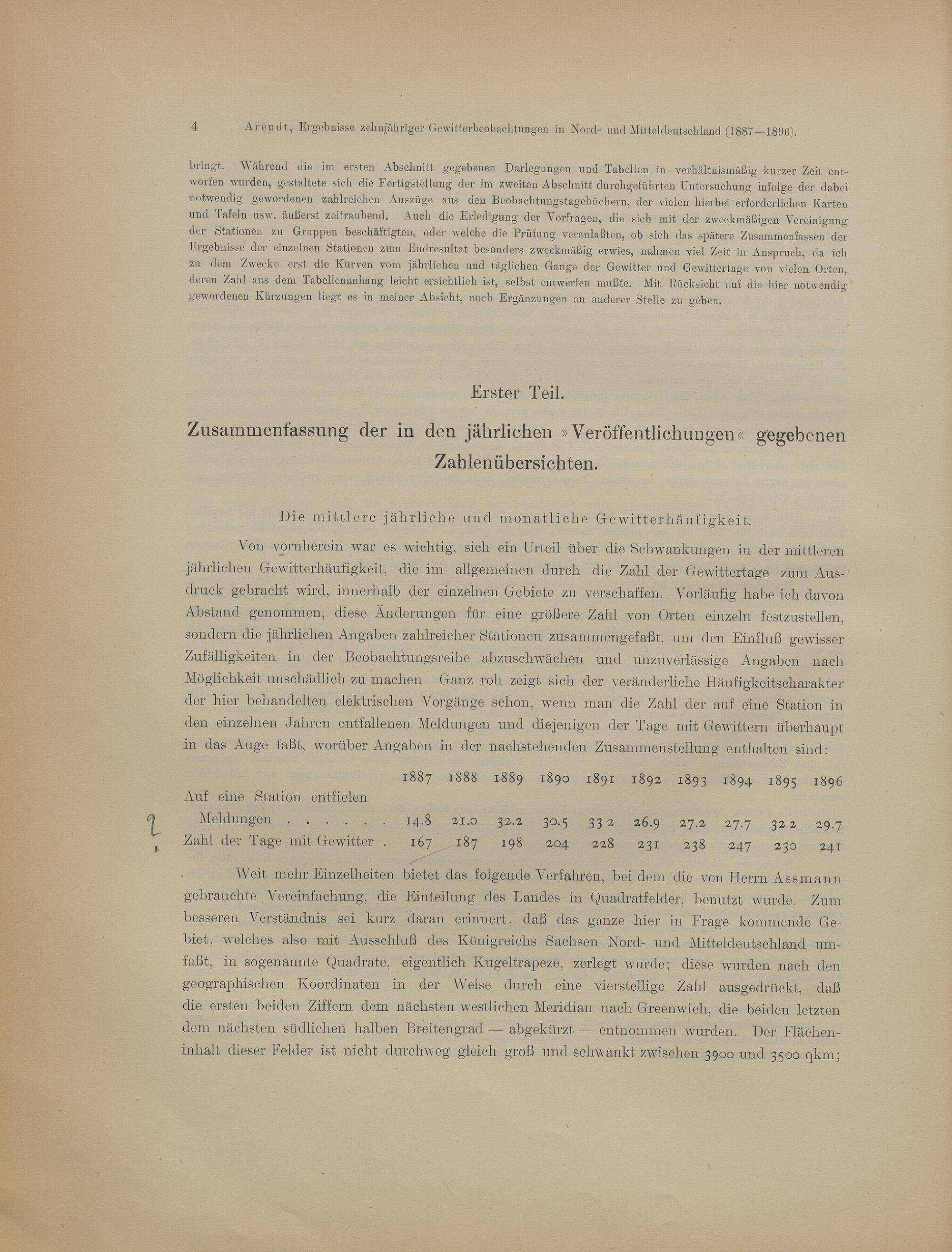 Tabellarische Übersichten zehnjähriger Gewitterbeobachtungen (1887-1896)