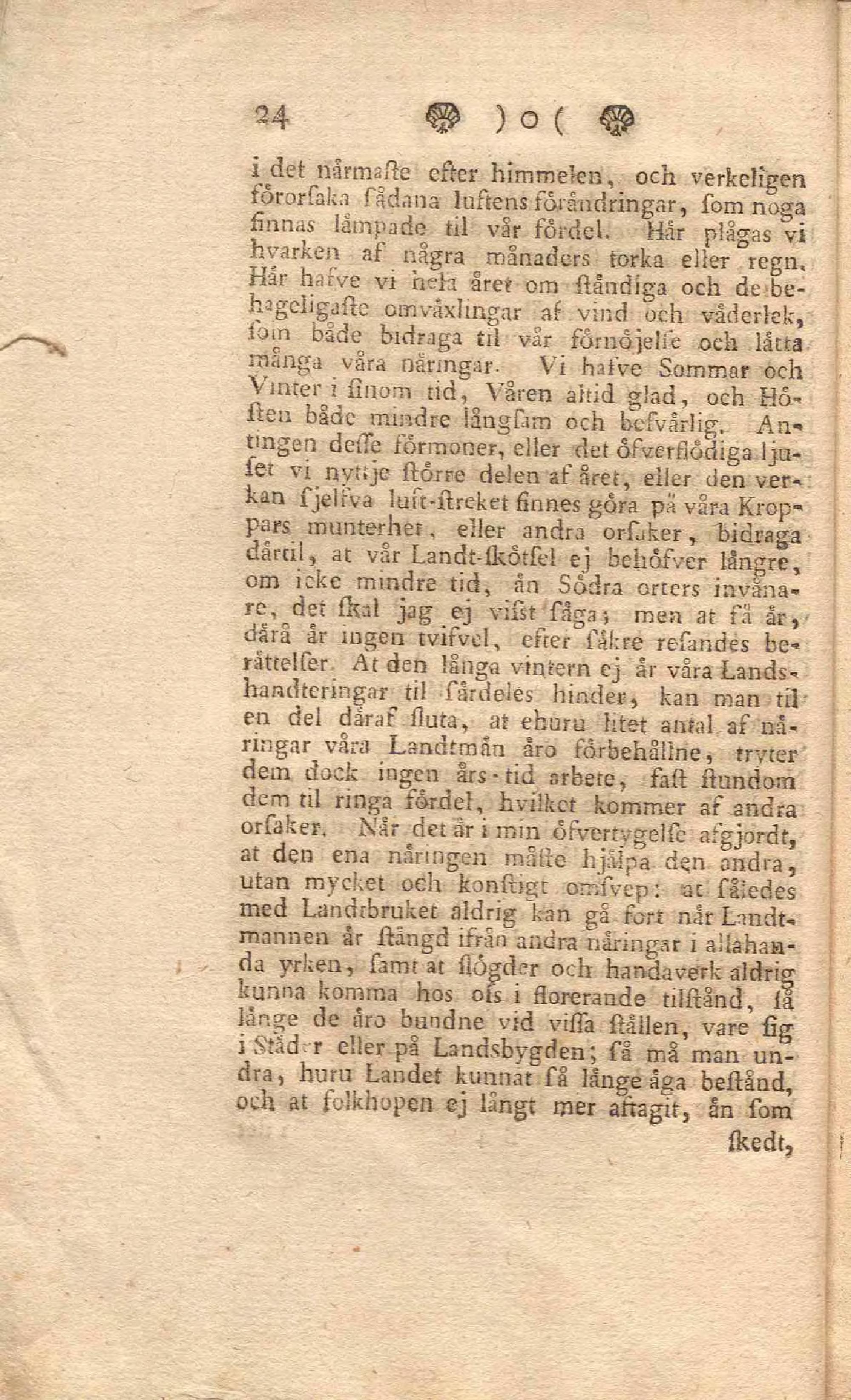 Svar på Kongl. Vetensk. Academiens För År 1764 Upgifna Fråga: Hvilka aero Svenska Climatets foermoner och olaegenheter, i anseende til allmaenna och enskildta husbållningen, i jaemfoe-foerelse emot andra Laenders?