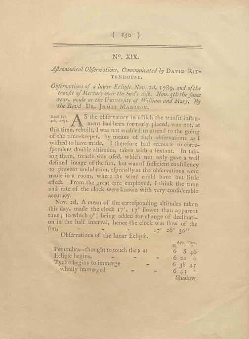 Astronomical observations : observations of a lunar Eclipse, Nov. 2d, 1789, and of the transit of Mercury over the Sun's disk. Nov. 5th the fame year, made at thte University of William and Mary, By the Revd Dr. James Madison / communicated by David Rittenhouse