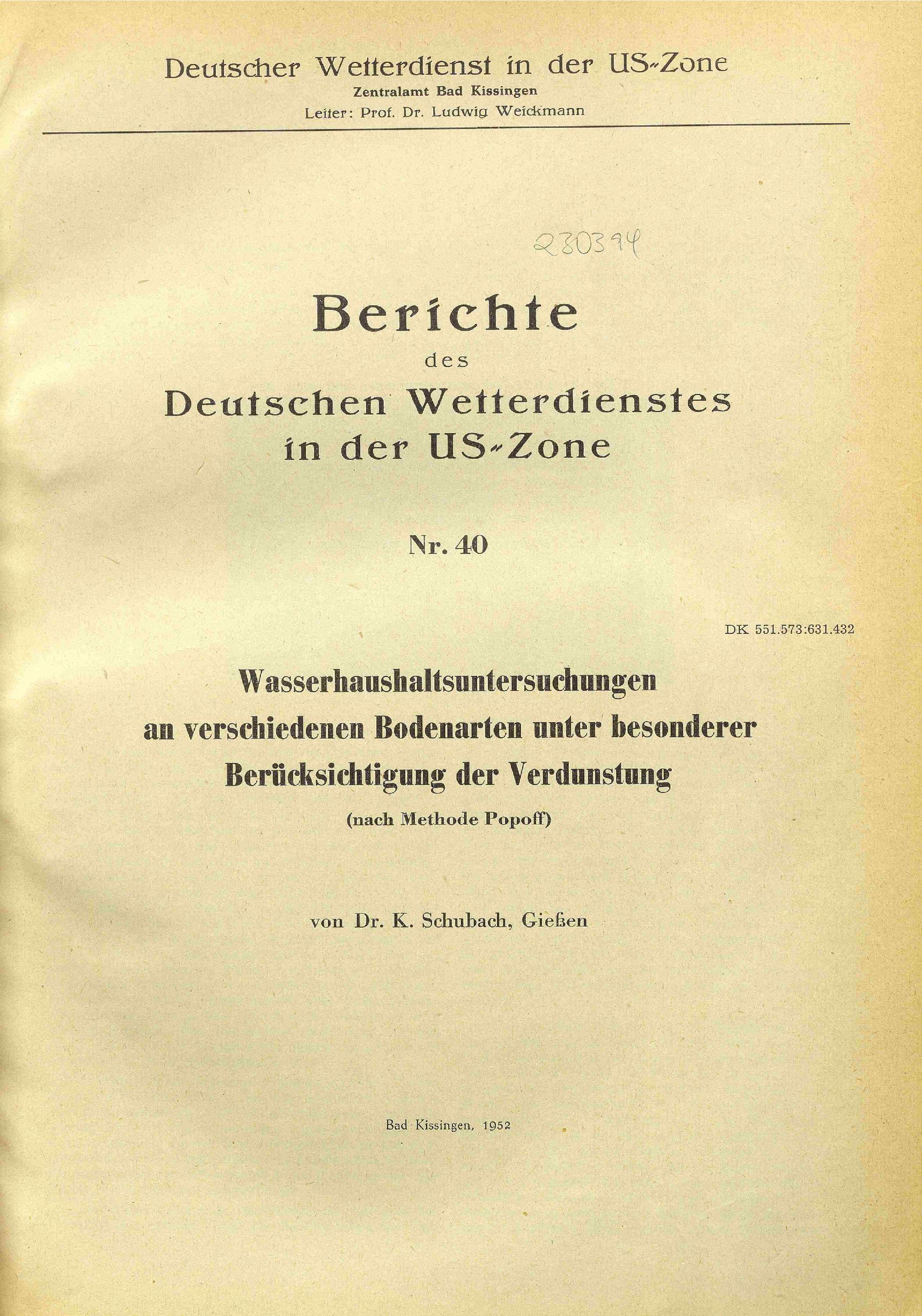 Wasserhaushaltsuntersuchungen an verschiedenen Bodenarten unter besonderer Berücksichtigung der Verdunstung : nach Methode Popoff / von K. Schubach