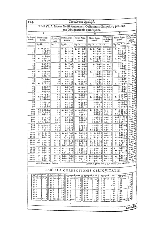 Tabulæ Rudolphinæ, Quibus Astronomicæ Scientiæ, Temporum longinquitate collapsæ Restauratio continetur : A Phœnice illo Astronomorum Tychone, Ex Illustri & Generosa Braheorum in Regno Daniæ familia oriundo Equite, Primum Animo Concepta Et Destinata Anno Christi MDLXIV: ... tracta per annos XXV, ... Tandem Traducta In Germaniam, In Que Aulam Et Nomen Rudolphi Imp. anno MDIIC. ; Tabulas Ipsas, Iam Et Nuncupatas, Et Affectas, Sed Morte Authoris Sui Anno MDCI Desertas, Iussu Et Stipendiis Fretus Trium Imppp. Rudolphi, Matthiae, Ferdinandi, Annitentibus Haeredibus Braheanis; Ex Fundamentis Observationum relictarum ... continuis multorum annorum speculationibus & computationibus, primum Pragae Bohemorum continuavit / deinde Lincii ... subsidiis etiam Ill. Provincialium adiutus, perfecit, absolvit, adq[ue] causarum & calculi perennis formulam traduxit Joannes Keplerus, Tychoni primum a Rudolpho II. Imp. adiunctus calculi minister ; indeq[ue] trium ordine Imppp. Mathematicus ...