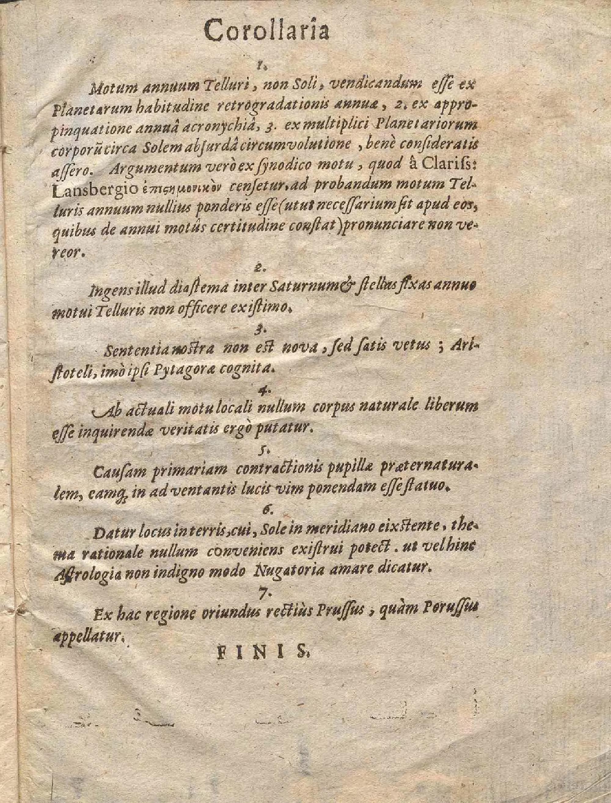 Disputatio Theorematica Astrvens Motvm Divrnvm Telluri Vendicandvm Esse / Quam Publicæ ventilationi subiicit M. Albertvs Linemannvs (Prusso-Fischhusinus, Mathematum in Academiâ Regiomontana Professor Publicus) Respondente Reinholdo Nauwerck (Regiomontano Prusso) Ad diem 5. Maij, horis â 7. matutinis in Auditorîo majori