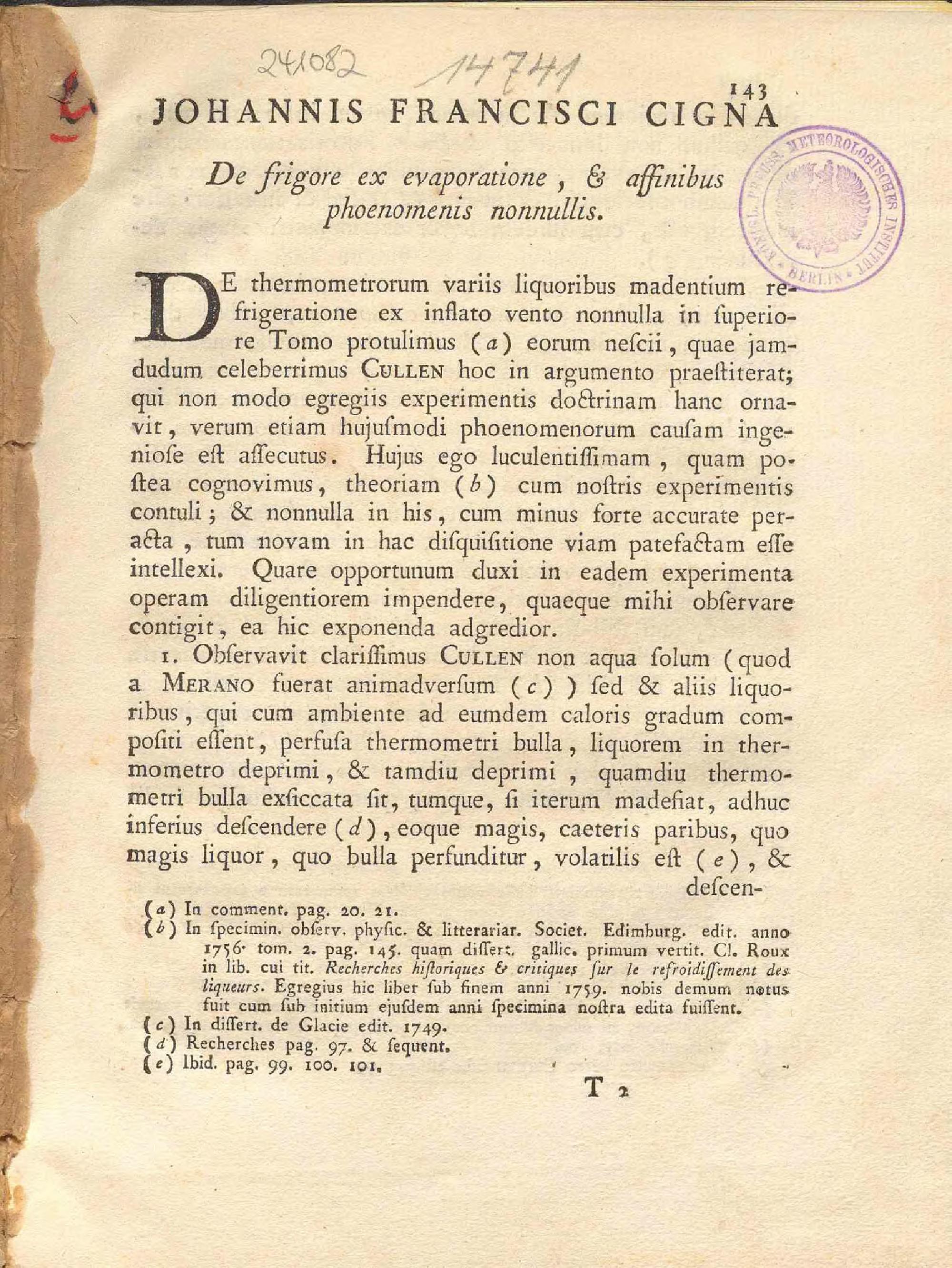De frigore ex evaporatione, & affinibus phoenomenis nonnullis / Johannis Francisci Cigna