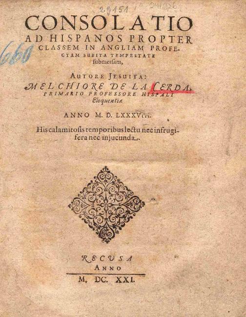 Consolatio Ad Hispanos Propter Classem in Angliam Profectam Subita Tempestate submersam : His calamitosis temporibus lectu nec infrugifera nec injucunda / Autore Jesuita: Melchiore de la Cerda (Primario Professore Hispali Eloquentiæ) Anno M.D.LXXXVIII