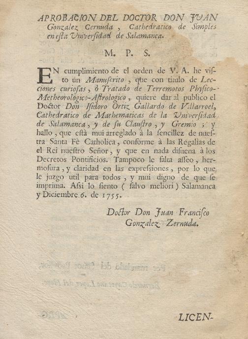 Lecciones Entretenidas Y Curiosas Physico-Astrologico-Metheorologicas Sobre La Generacion, Causas Y Señales De Los Terremotos Y Especialmente De Las Causas, señales y varios efectos del sucedido en España, en el día primero de Noviembre del año pasado de 1775 : Dedicadas Al Señor D. Diego De Torres Villarroel, Del Gremio, Y Claustro De Esta Universidad de Salamanca, y su Cathedratico de Prima de Mathematicas Jubilado por el Rei nuestro Señor / Hechas Por Su Sobrino El Doctor D. Isidoro Ortiz Gallardo de Villarroel, del mismo Gremio, y Claustro, y actual Cathedratico en la misma de Mathematicas