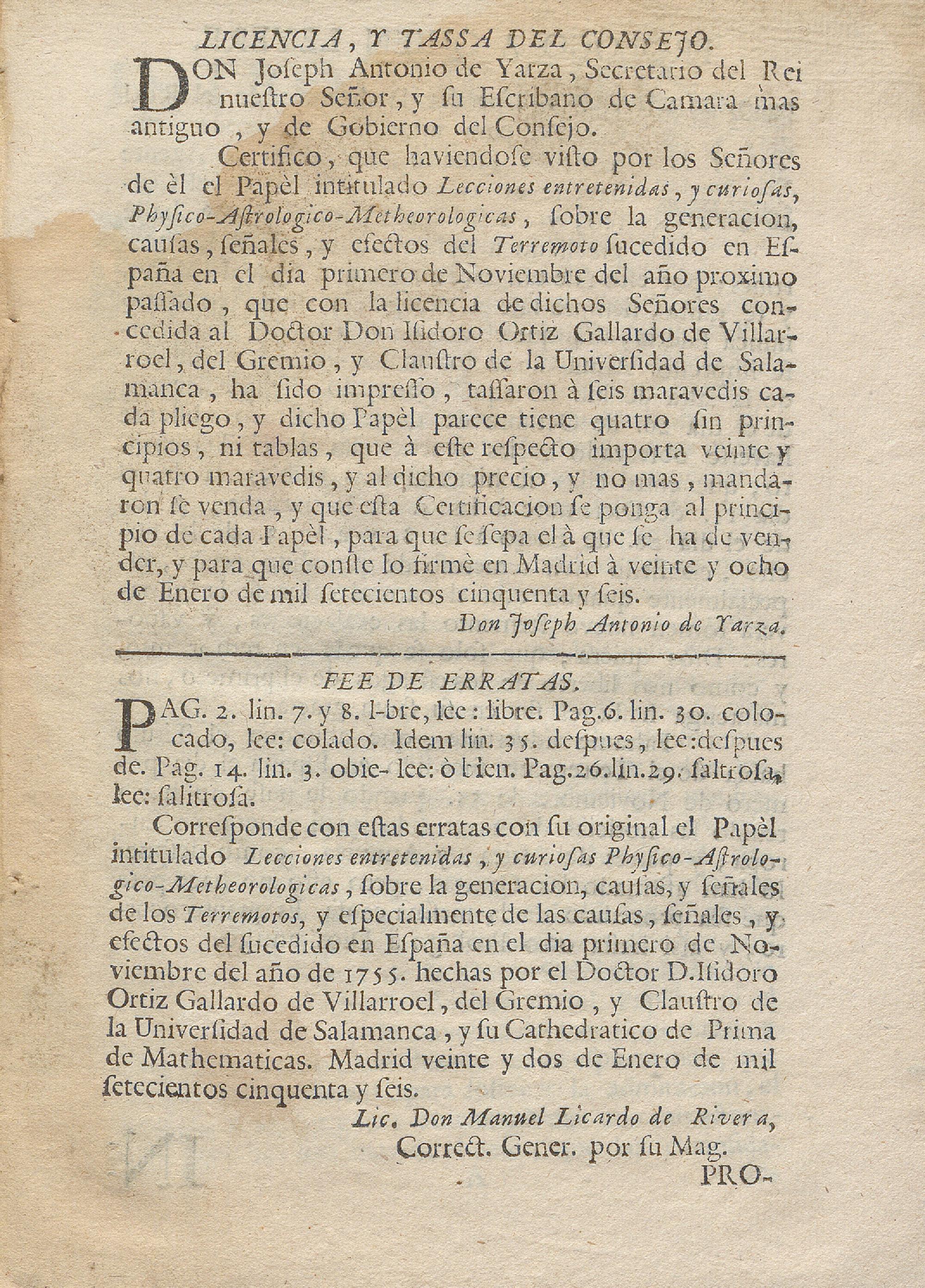 Lecciones Entretenidas Y Curiosas Physico-Astrologico-Metheorologicas Sobre La Generacion, Causas Y Señales De Los Terremotos Y Especialmente De Las Causas, señales y varios efectos del sucedido en España, en el día primero de Noviembre del año pasado de 1775 : Dedicadas Al Señor D. Diego De Torres Villarroel, Del Gremio, Y Claustro De Esta Universidad de Salamanca, y su Cathedratico de Prima de Mathematicas Jubilado por el Rei nuestro Señor / Hechas Por Su Sobrino El Doctor D. Isidoro Ortiz Gallardo de Villarroel, del mismo Gremio, y Claustro, y actual Cathedratico en la misma de Mathematicas