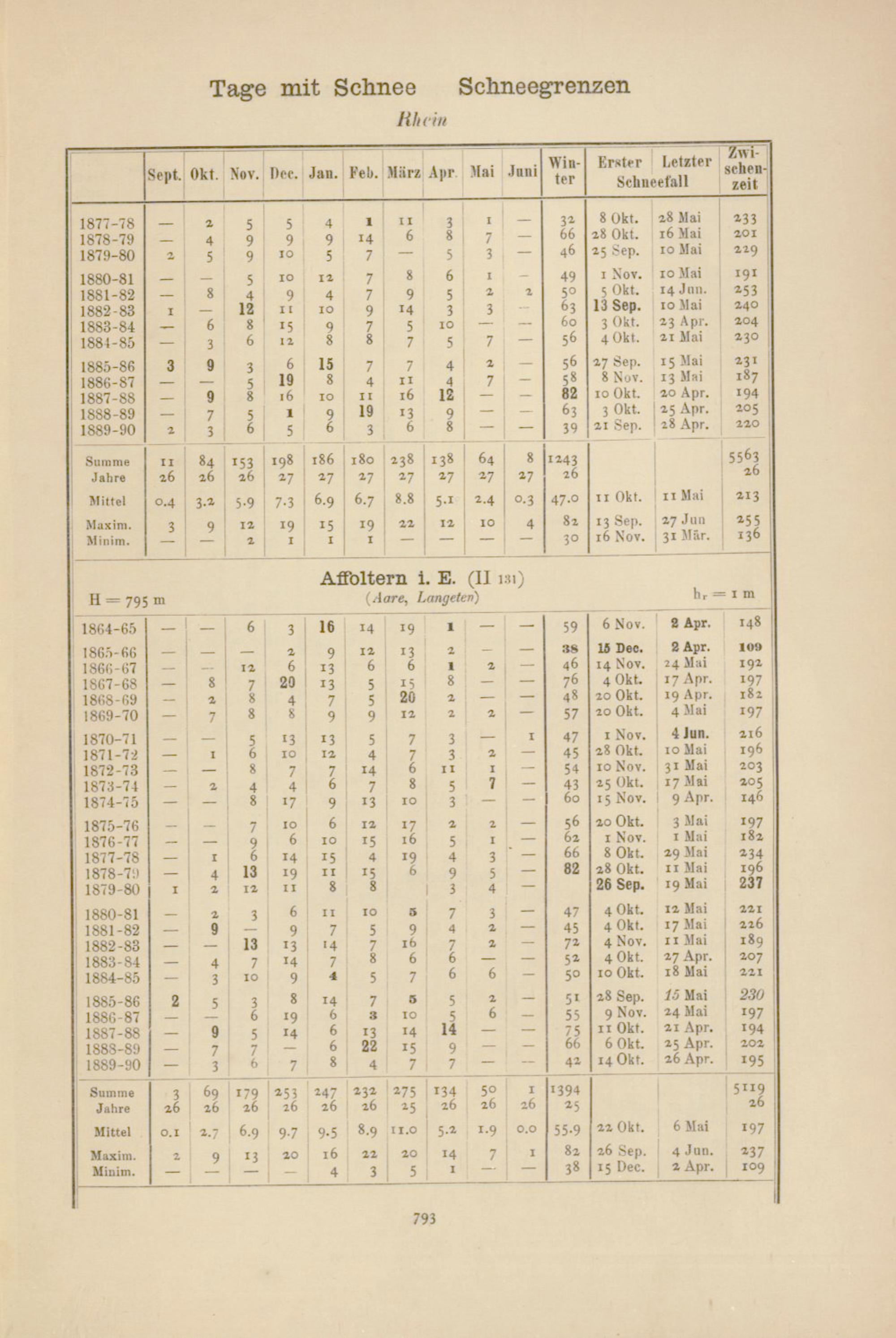 Zahl der Tage mit Schnee, Schneegrenzen