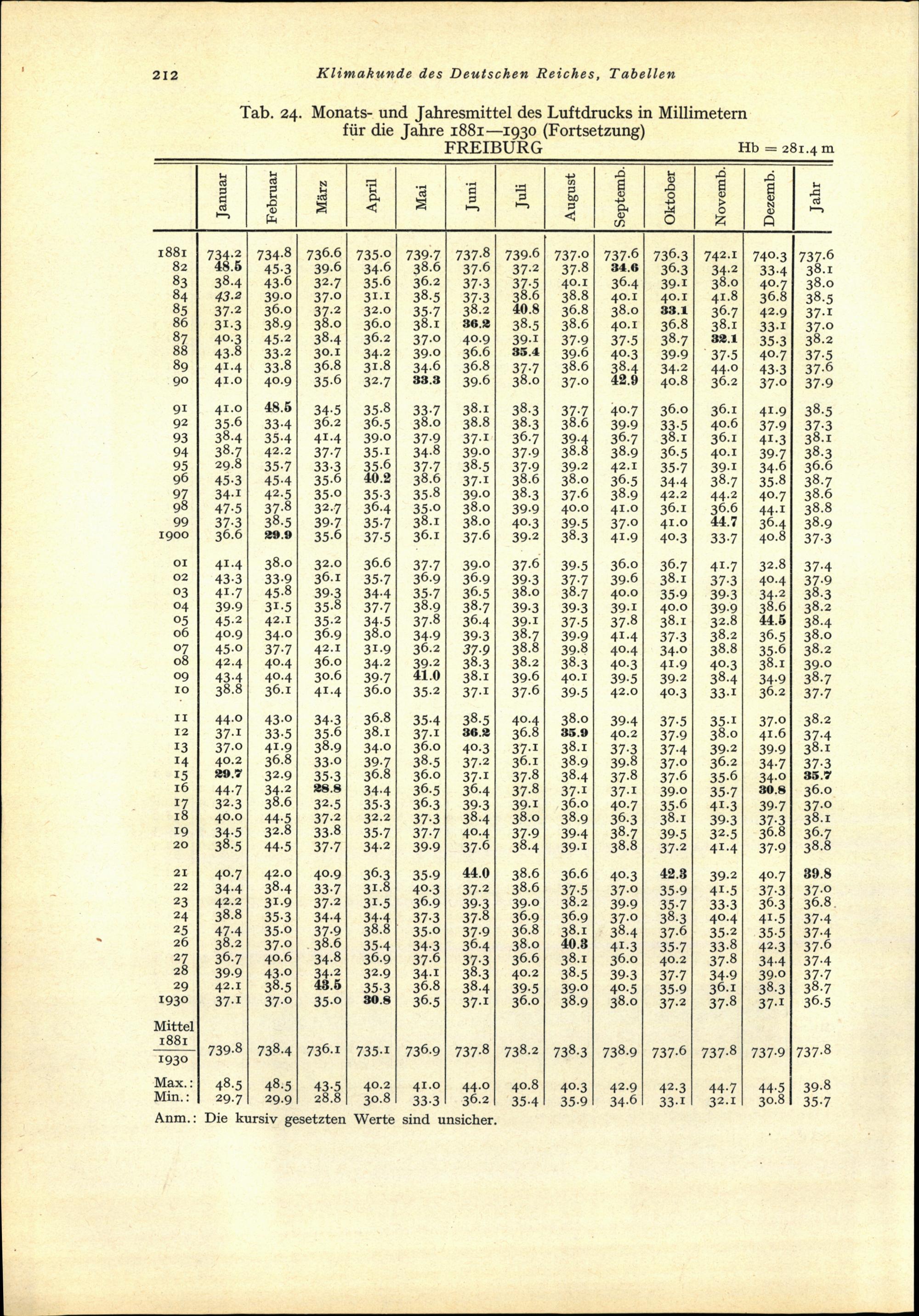 Tab. 24: Monats- und Jahresmittel des Luftdrucks in Millimetern für die Jahre 1881-1930...