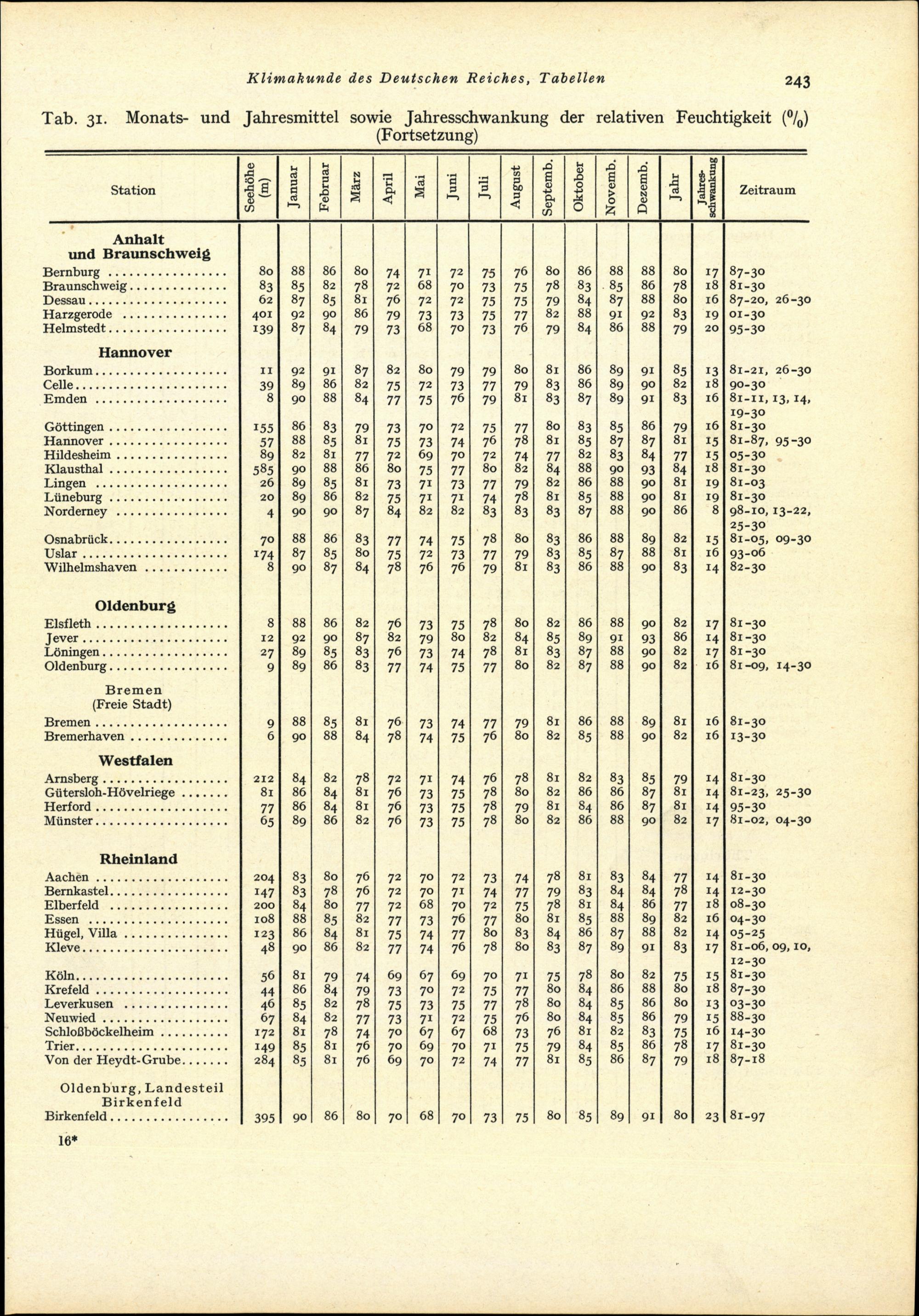 Tab. 31: Monats- und Jahresmittel sowie Jahresschwankung der relativen Feuchtigkeit...