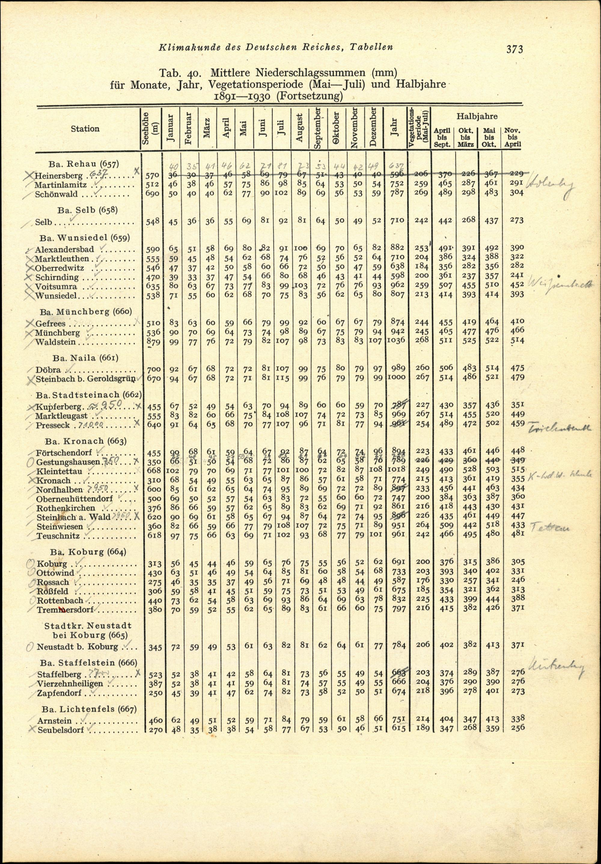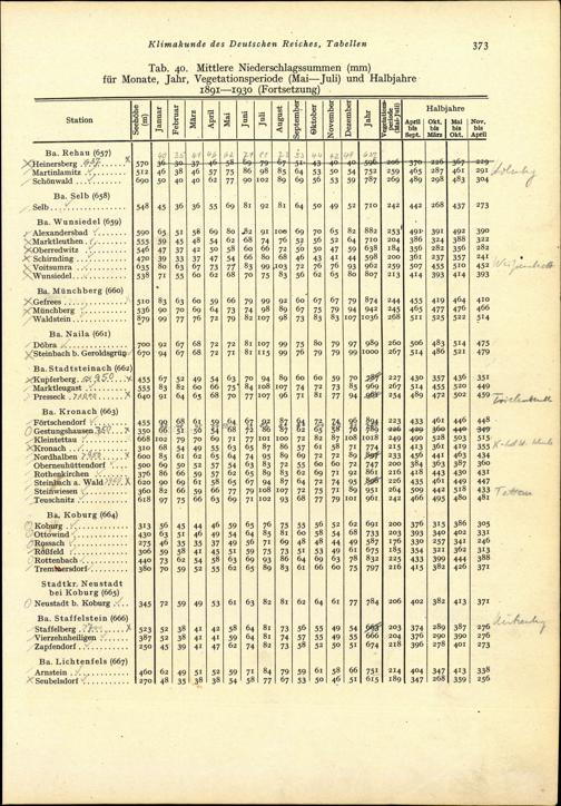 Tab. 40: Mittlere Niederschlagssummen (mm) für Monate, Jahr, Vegetationsperiode (Mai-Juli)...
