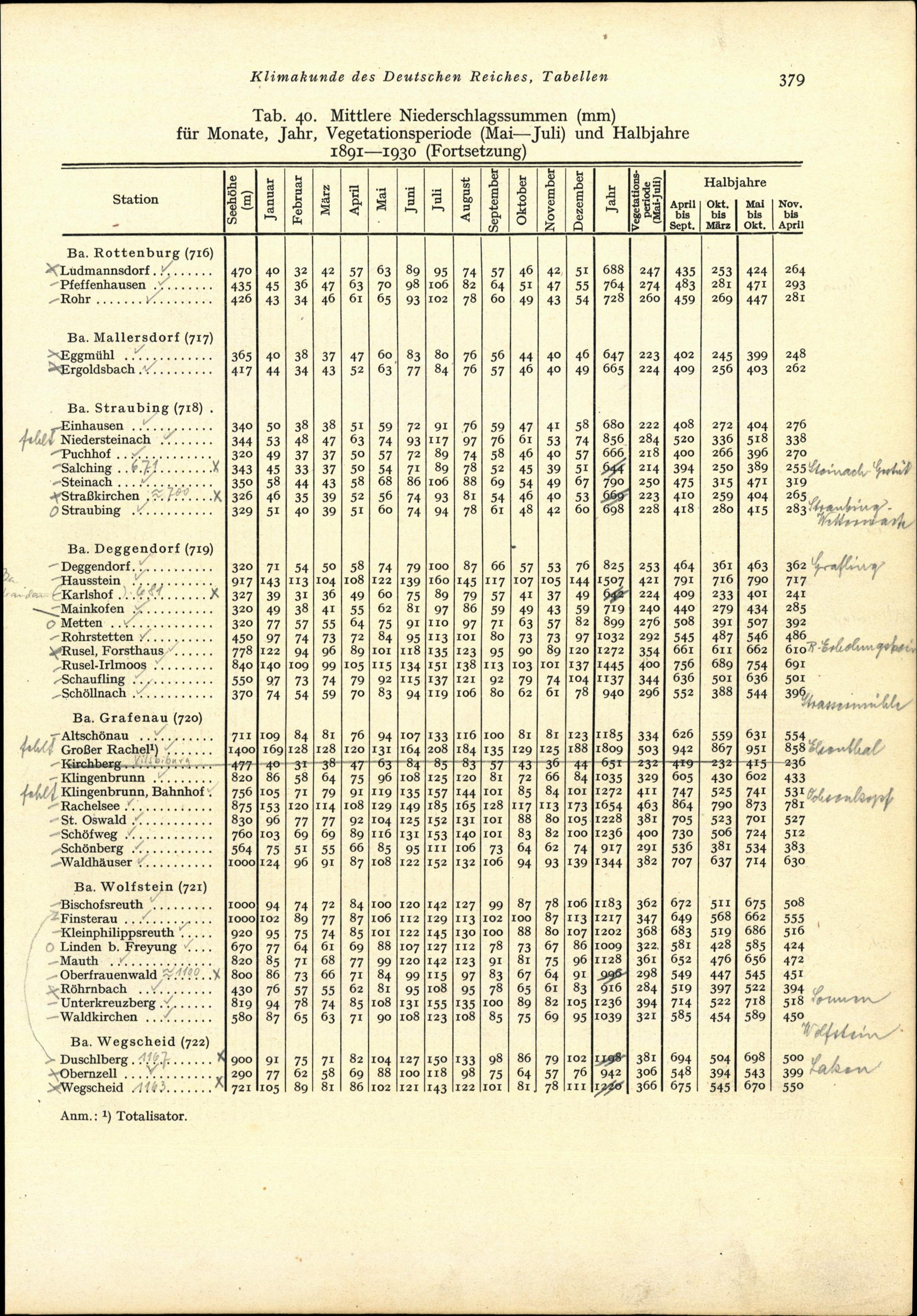 Tab. 40: Mittlere Niederschlagssummen (mm) für Monate, Jahr, Vegetationsperiode (Mai-Juli)...