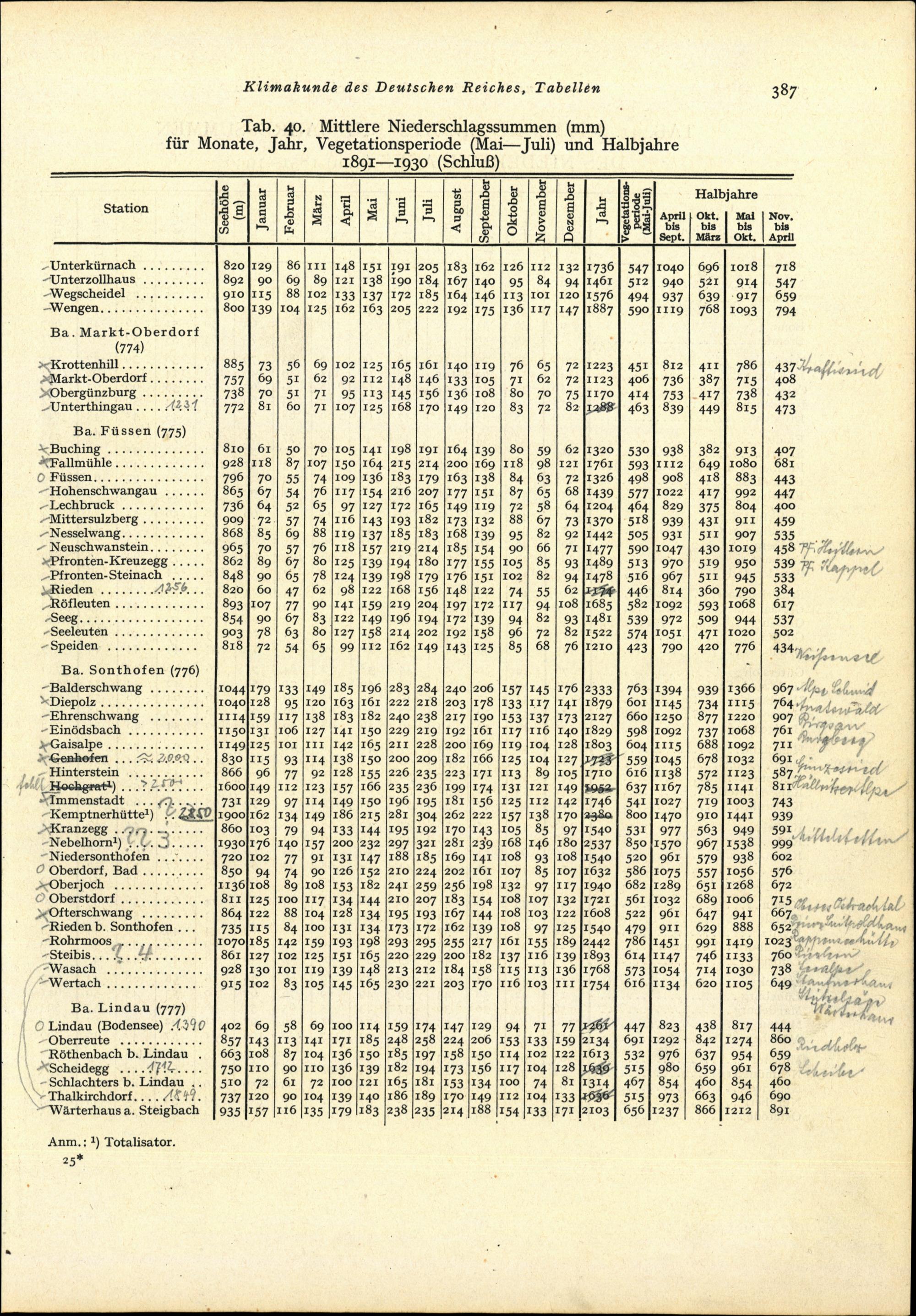 Tab. 40: Mittlere Niederschlagssummen (mm) für Monate, Jahr, Vegetationsperiode (Mai-Juli)...