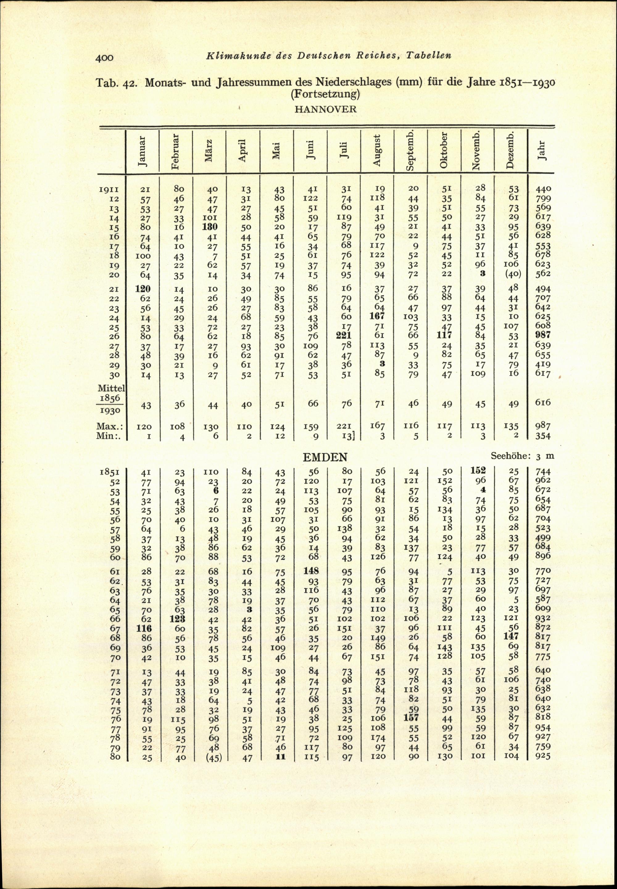 Tab. 42: Monats- und Jahressummen des Niederschlages (mm) für die Jahre 1851-1930...