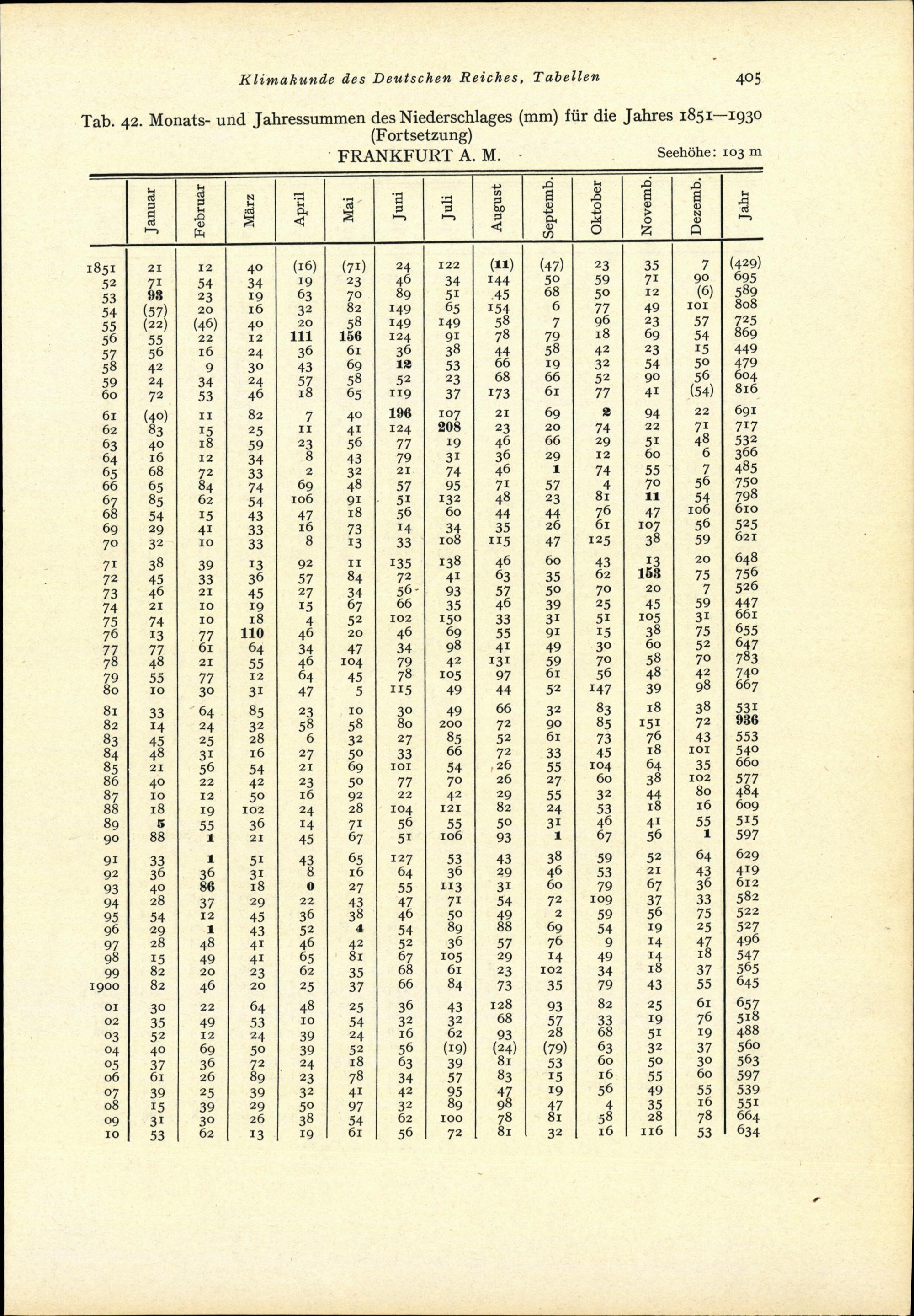 Tab. 42: Monats- und Jahressummen des Niederschlages (mm) für die Jahre 1851-1930...