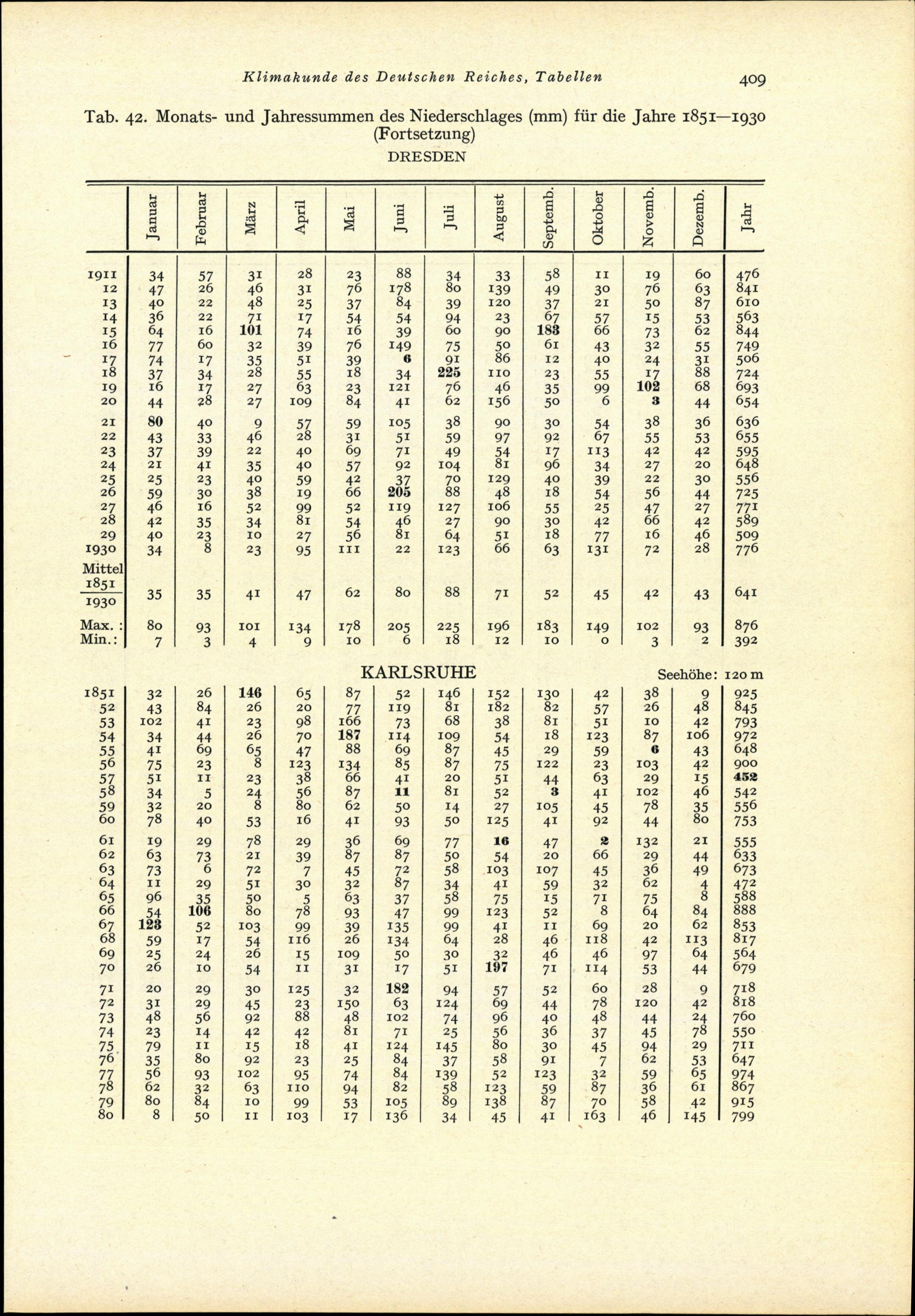 Tab. 42: Monats- und Jahressummen des Niederschlages (mm) für die Jahre 1851-1930...