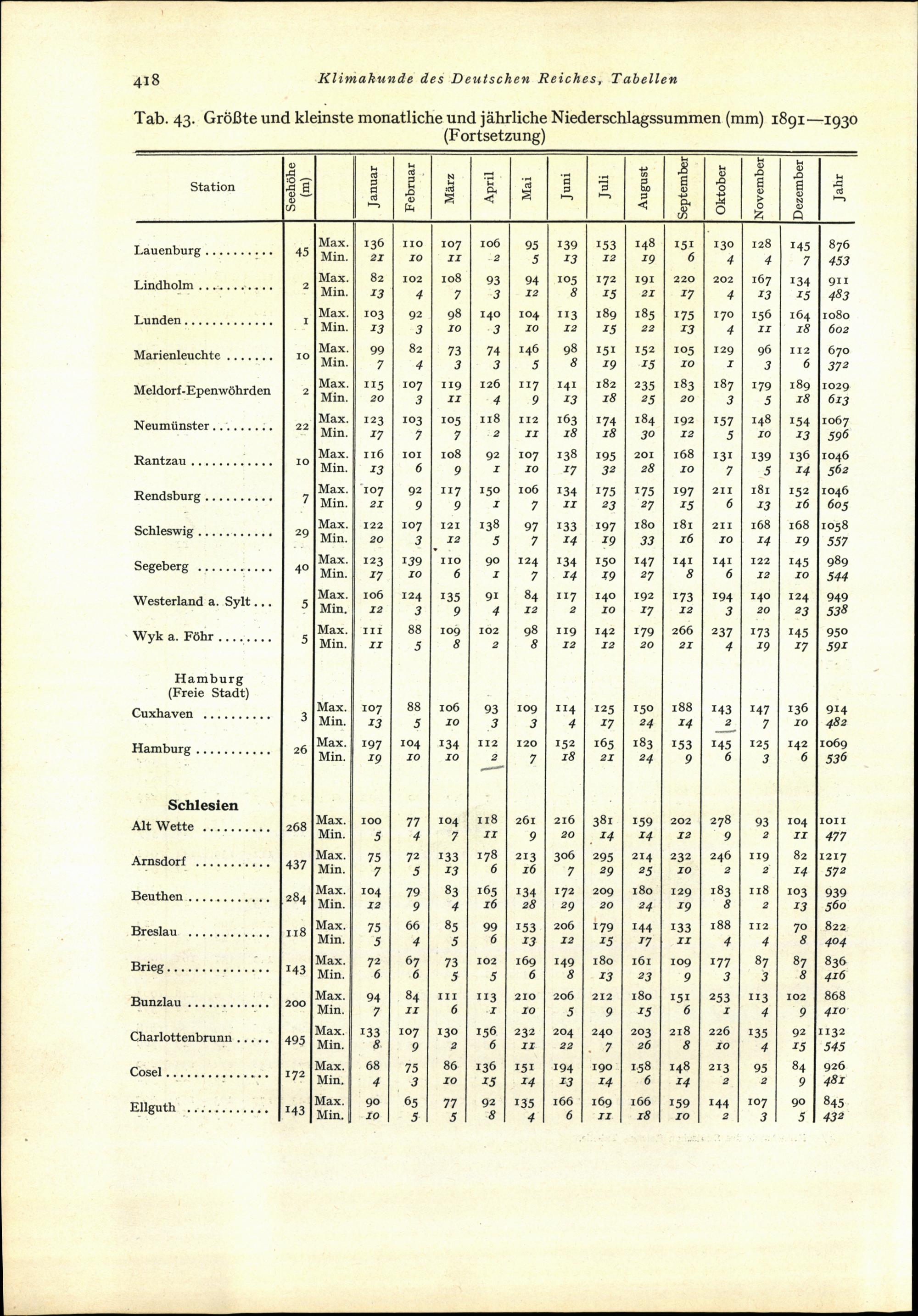 Tab. 43: Grösste und kleinste monatliche und jährliche Niederschlagssummen (mm) ...