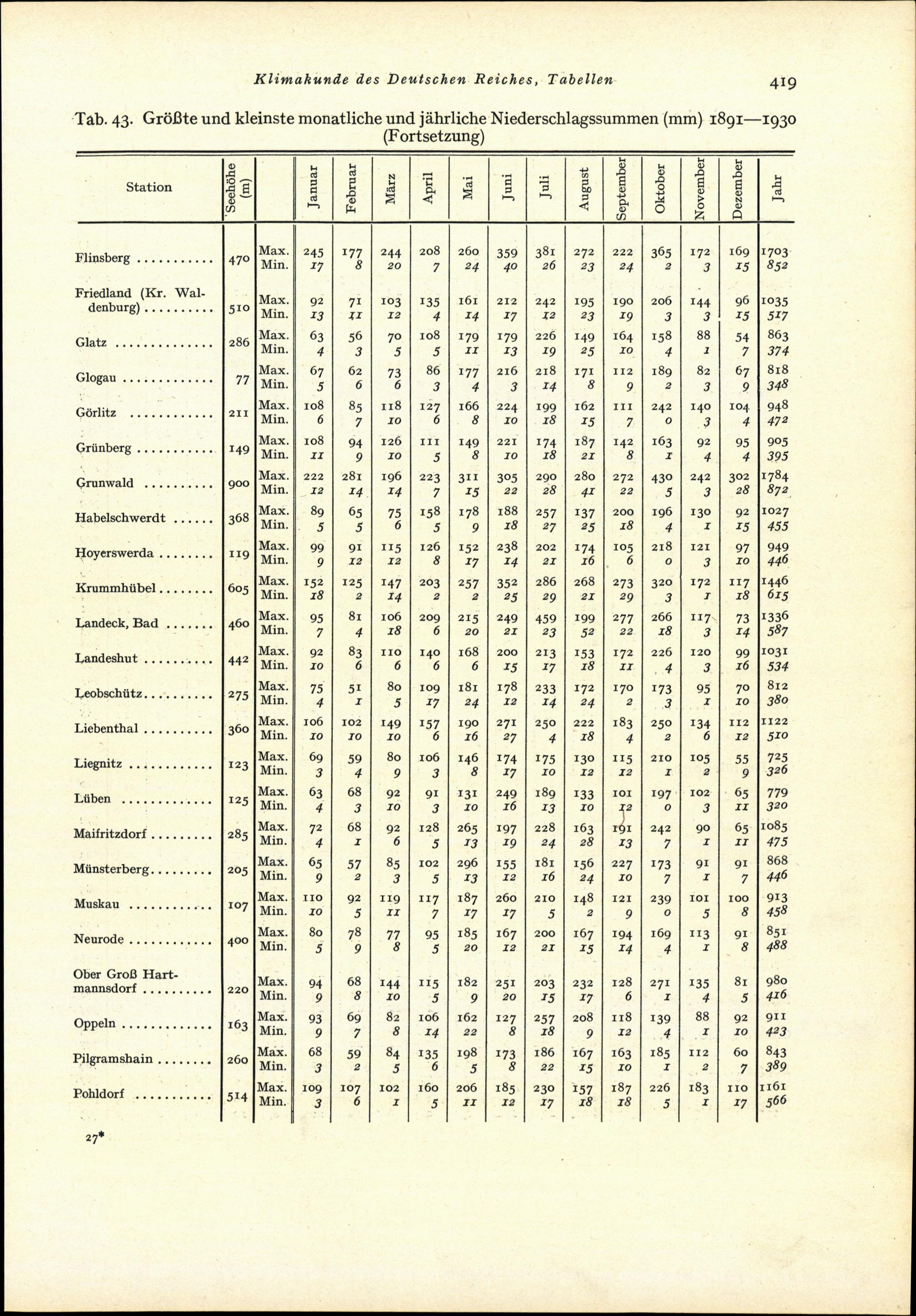 Tab. 43: Grösste und kleinste monatliche und jährliche Niederschlagssummen (mm) ...