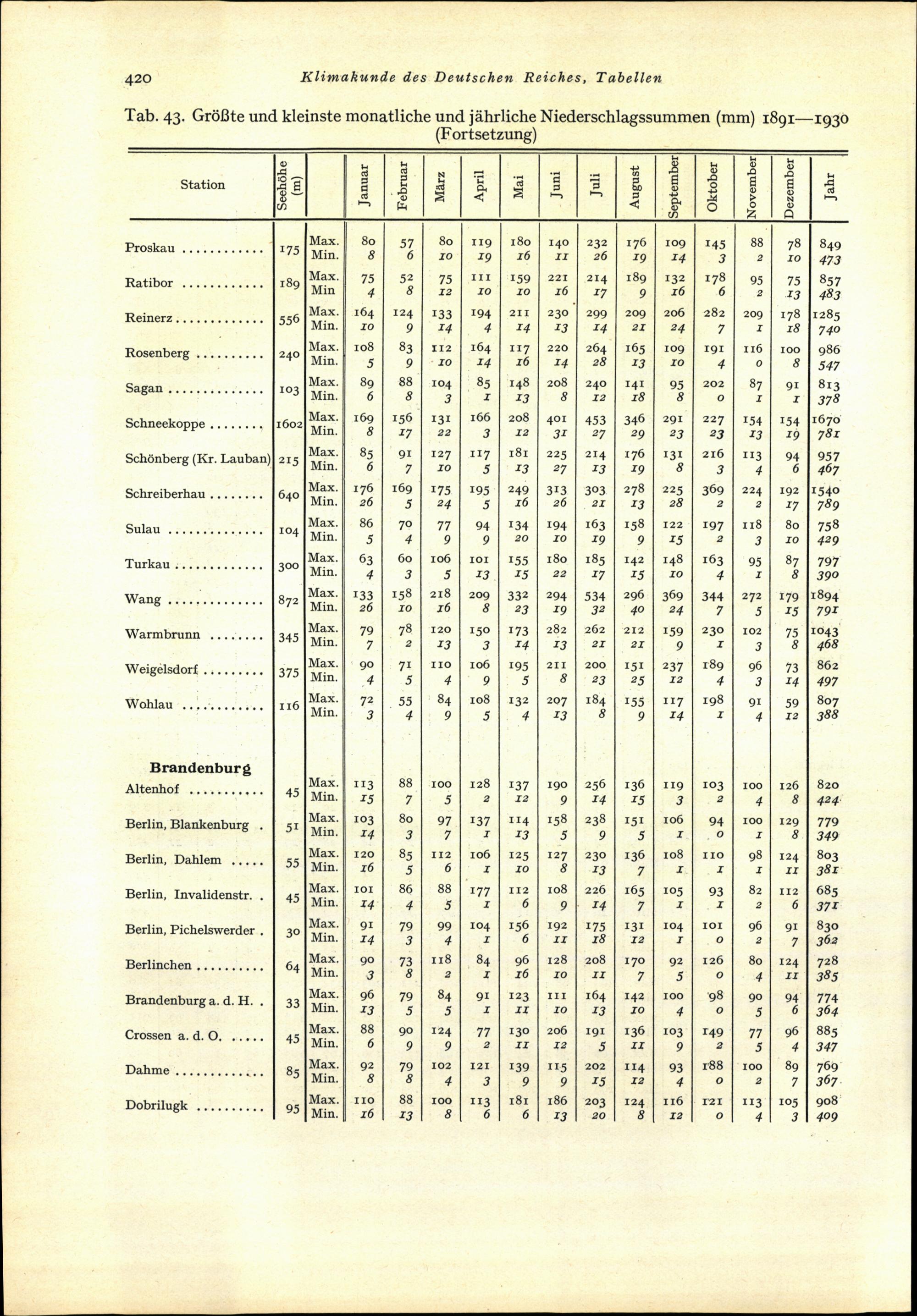 Tab. 43: Grösste und kleinste monatliche und jährliche Niederschlagssummen (mm) ...
