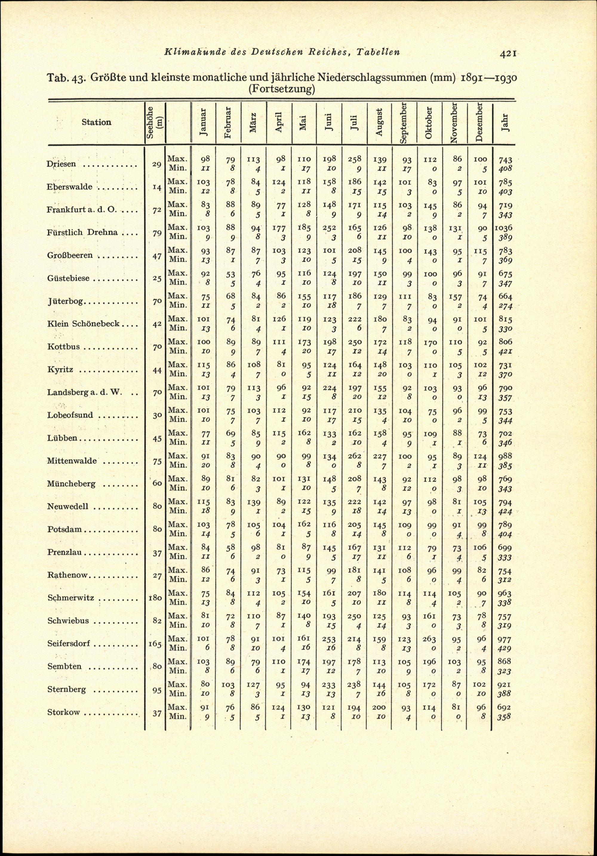 Tab. 43: Grösste und kleinste monatliche und jährliche Niederschlagssummen (mm) ...