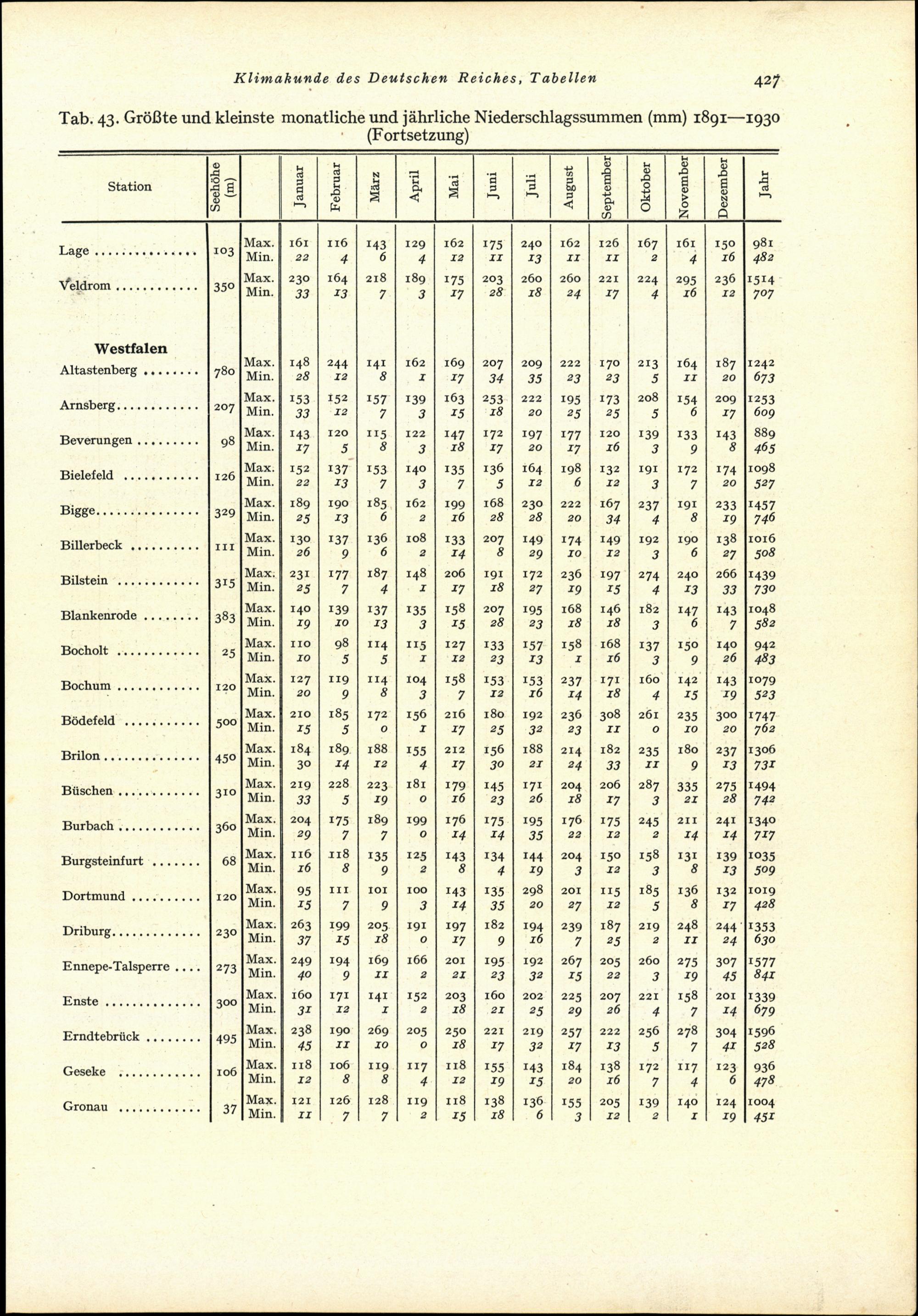 Tab. 43: Grösste und kleinste monatliche und jährliche Niederschlagssummen (mm) ...