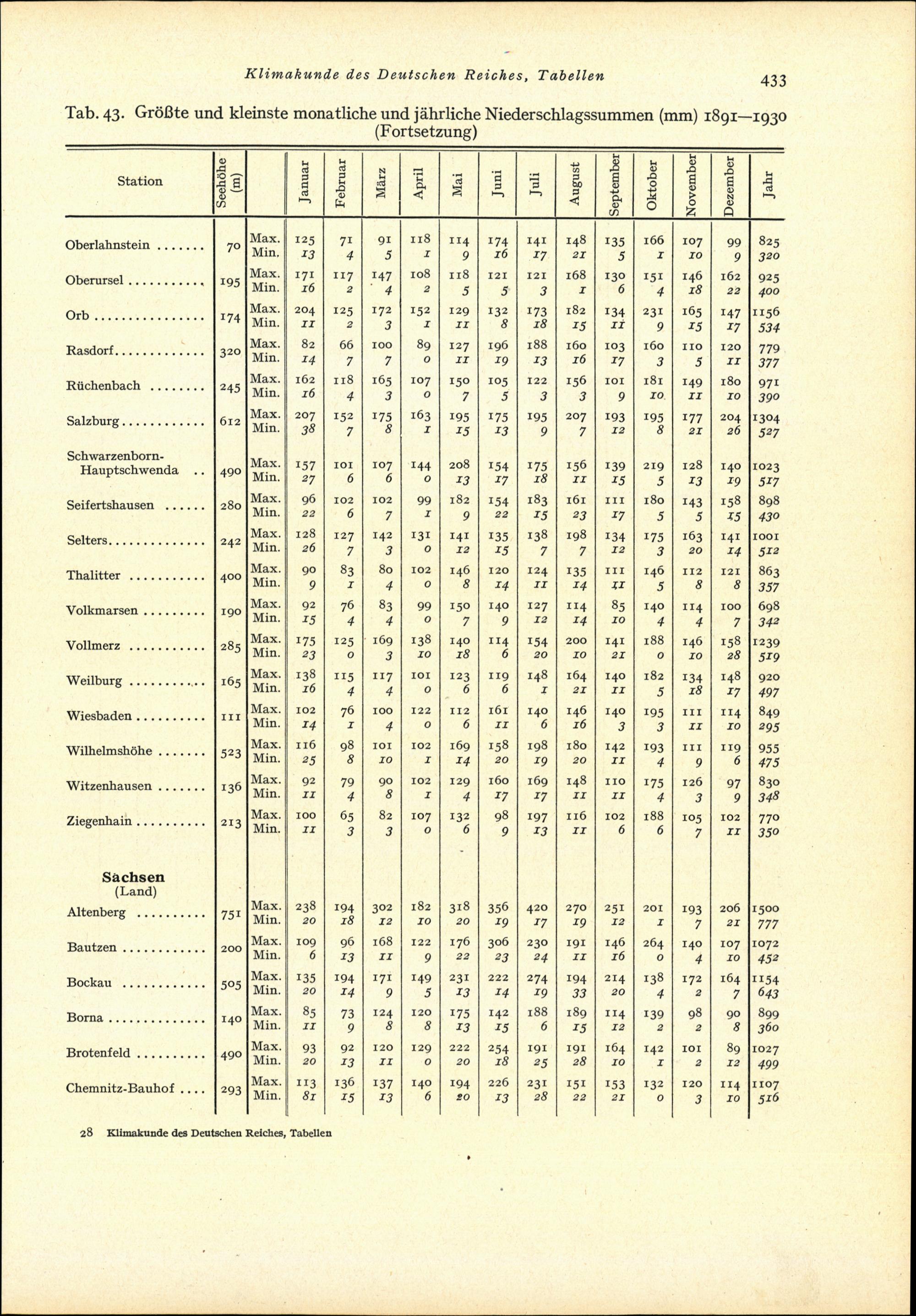 Tab. 43: Grösste und kleinste monatliche und jährliche Niederschlagssummen (mm) ...