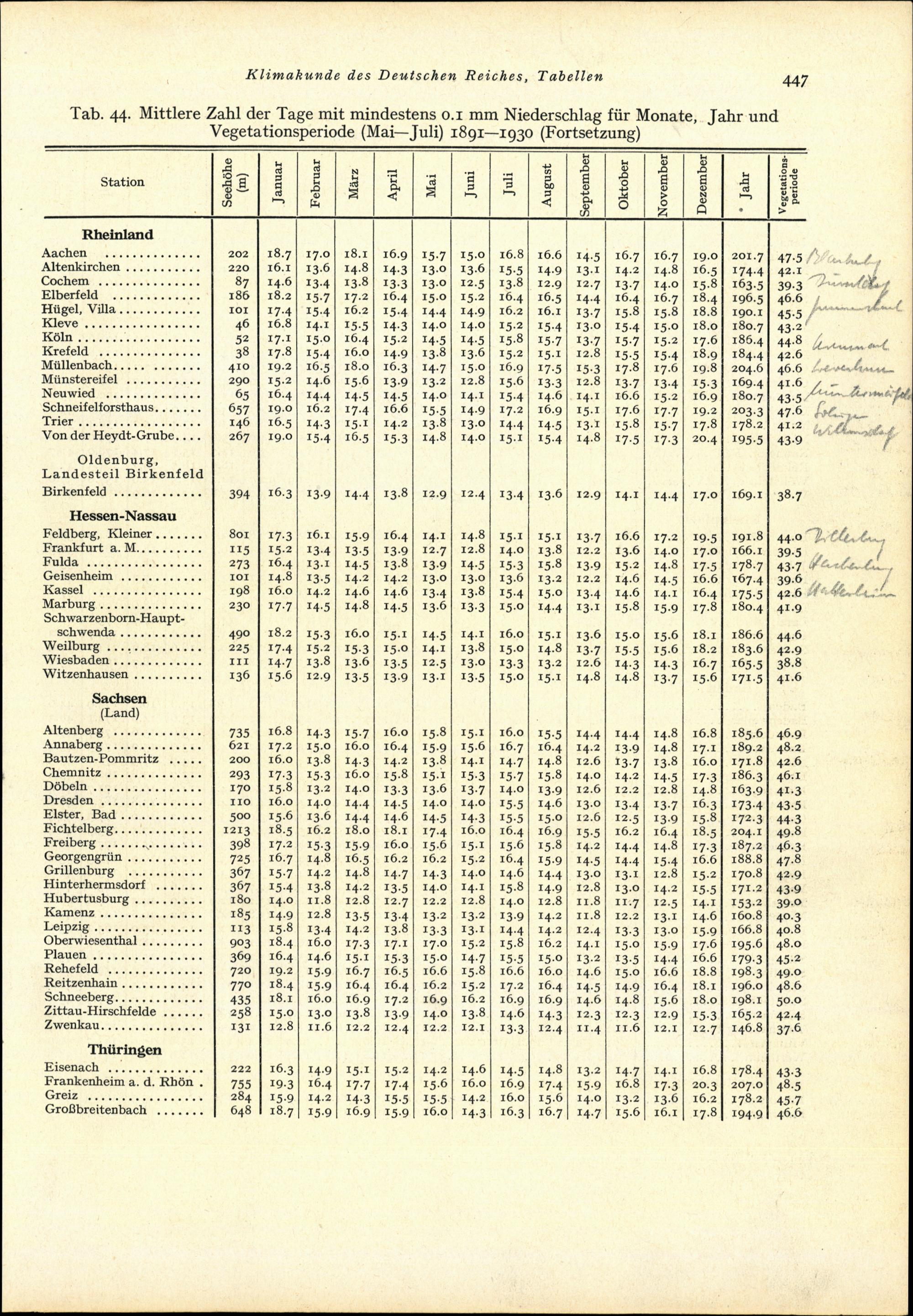 Tab. 44: Mittlere Zahl der Tage mit mindestens 0.1 mm Niederschlag für Monate, Jahr...