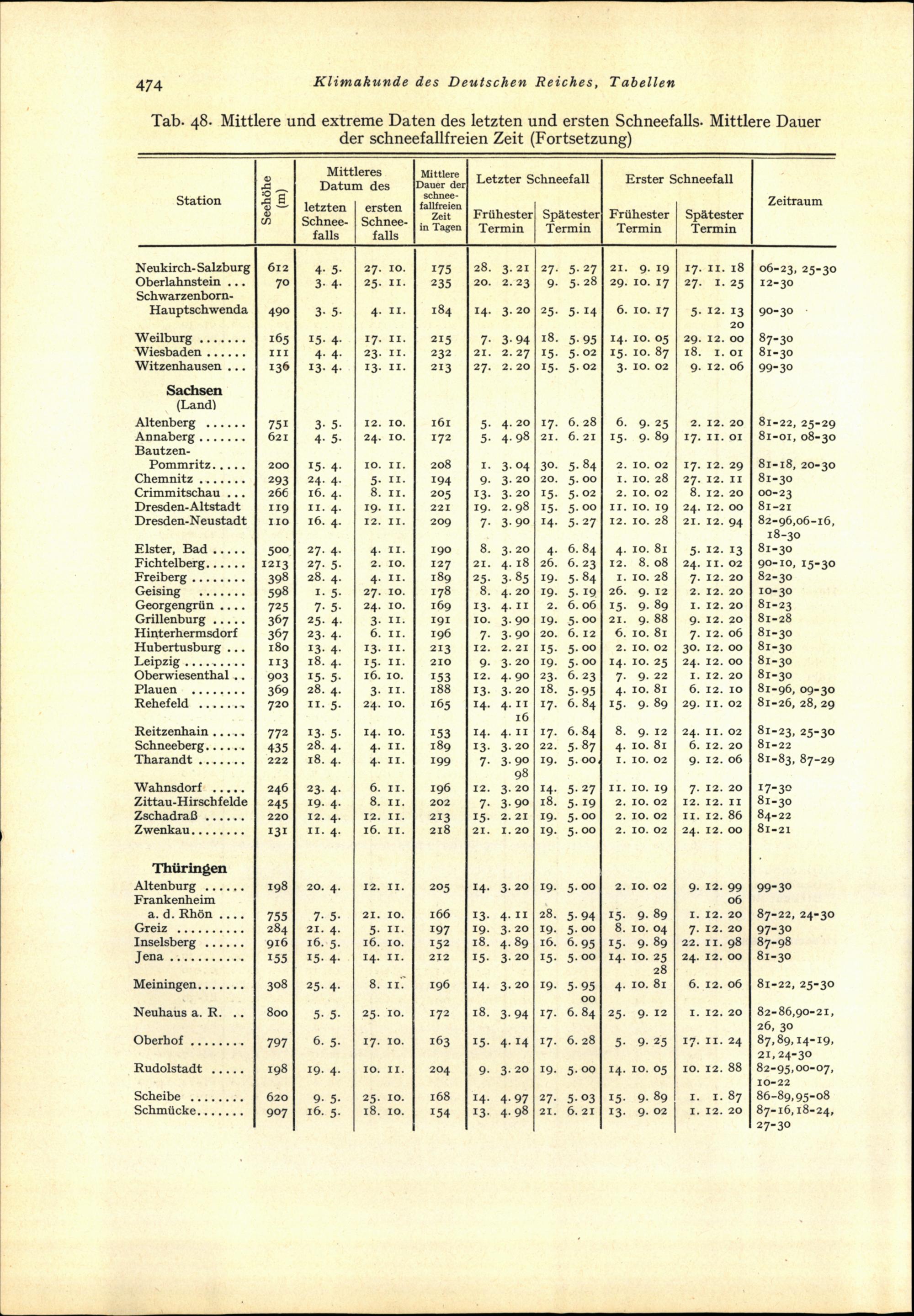 Tab. 48: Mittlere und extreme Daten des letzten und ersten Schneefalls. Mittlere...