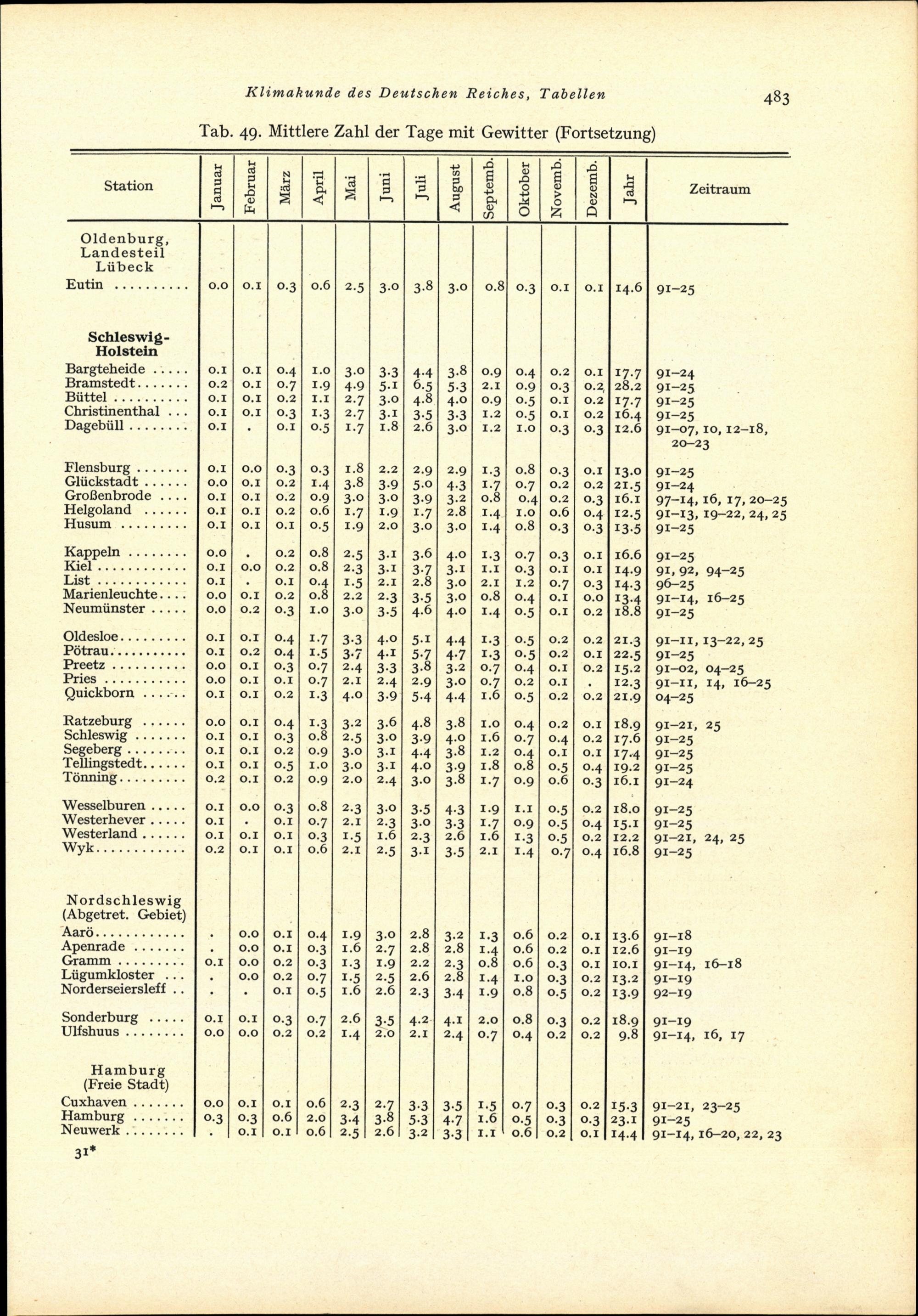 Tab. 49: Mittlere Zahl der Tage mit Gewitter