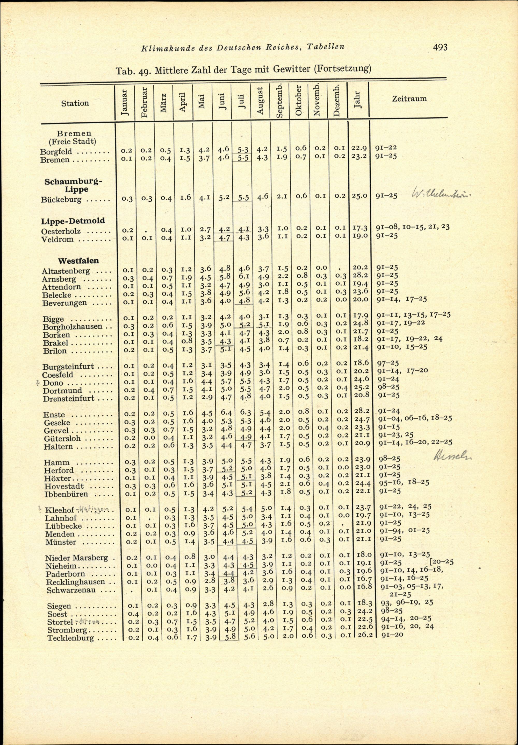Tab. 49: Mittlere Zahl der Tage mit Gewitter