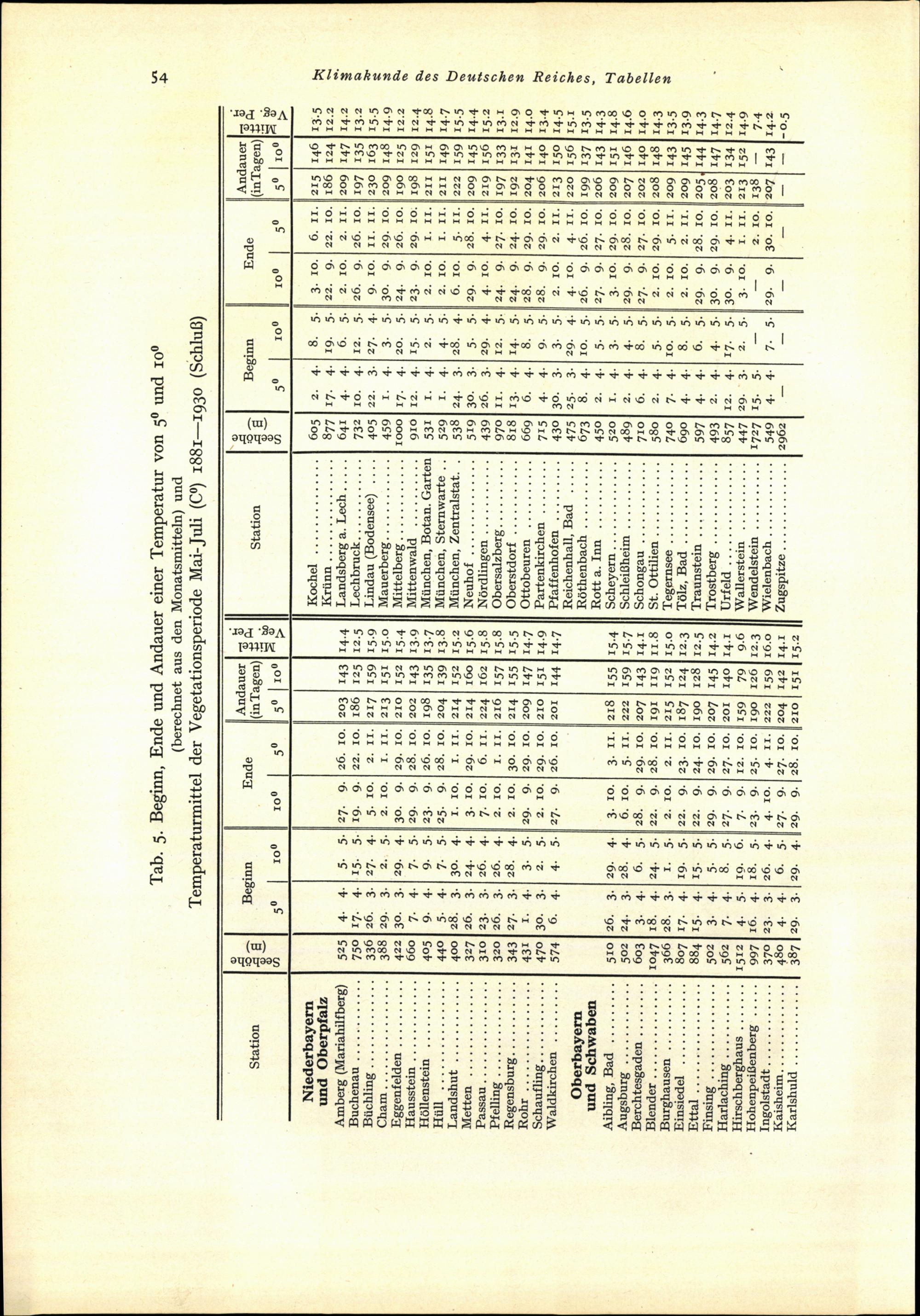 Tab. 5: Beginn, Ende und Andauer einer Temperatur von 5° und 10°