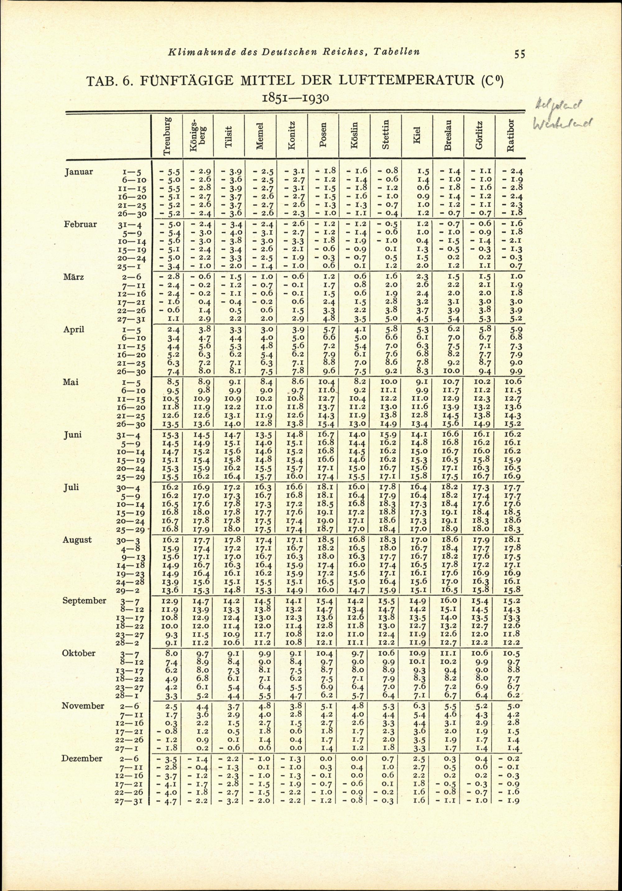 Tab. 6: Fünftägige Mittel der Lufttemperatur (C°) 1851-1930