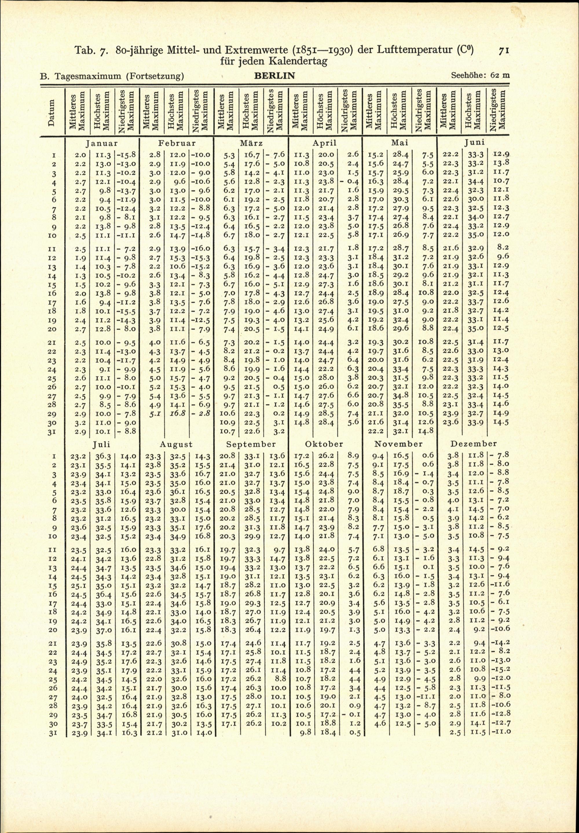 Tab. 7: 80-jährige Mittel- und Extremwerte (1851-1930) der Lufttemperatur (C°) für...