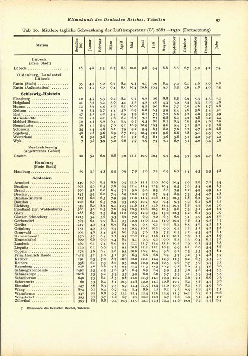 Tab. 10: Mittlere tägliche Schwankung der Lufttemperatur (C°) 1881-1930