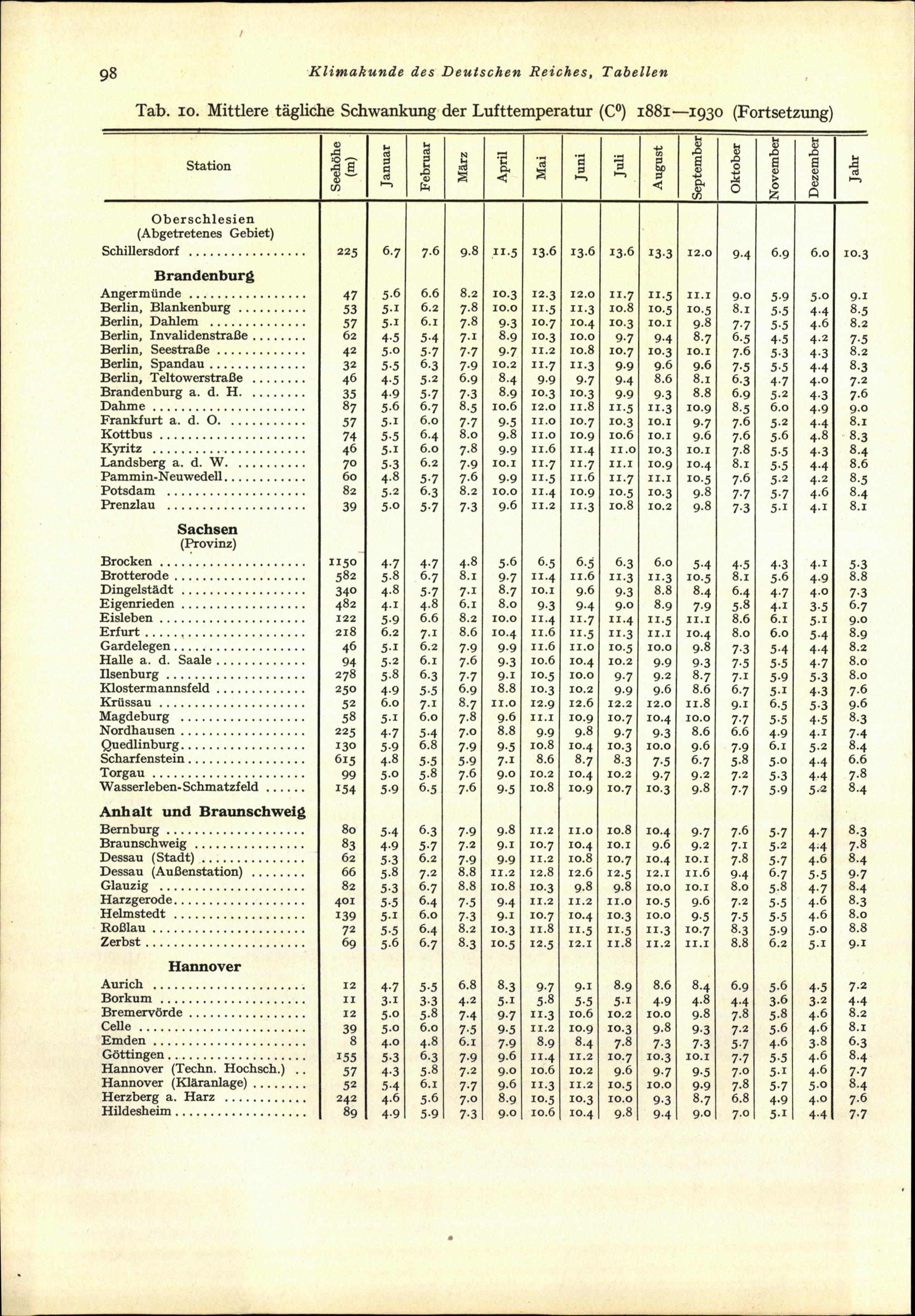 Tab. 10: Mittlere tägliche Schwankung der Lufttemperatur (C°) 1881-1930