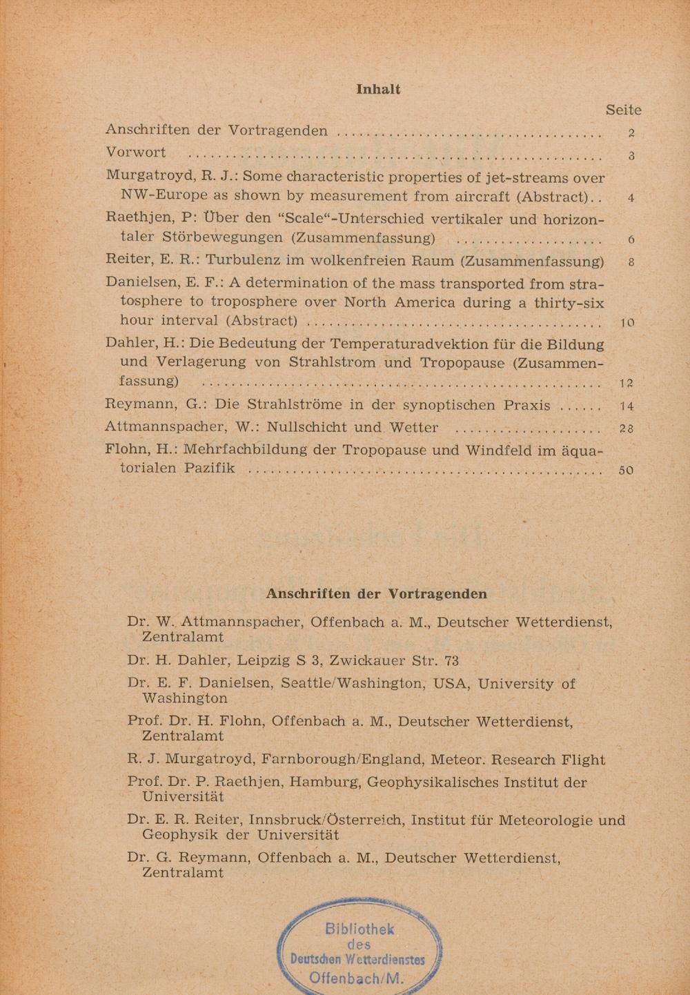 Die Fachsitzung "Strahlströmung und Tropopause" in Offenbach a. M. am 7. und 8. Oktober 1959