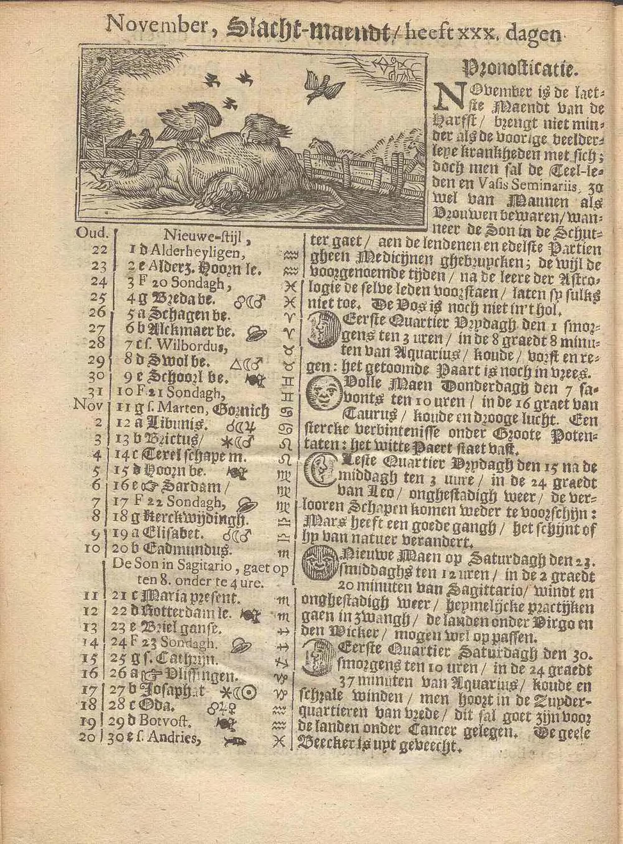 De Oprechte Italiaensche Waerseggher over de Constellatie der Planeten des Jaers/ 1669 : Als mede wat Landen onder yder Teecken des Zodiacx gelegen zyn, Daer neffens den Almanach, Mitsgaders de Namen der Levereyen van eenige Koningen/ Princen/ Hartogen en Graven/ Fc. Alles tot verlichtinge bau de Liefhebbers onser Prognosticatie / door den Hoog-geleerden Nicolaum Smidt, anders den geleerden Boer genaemt