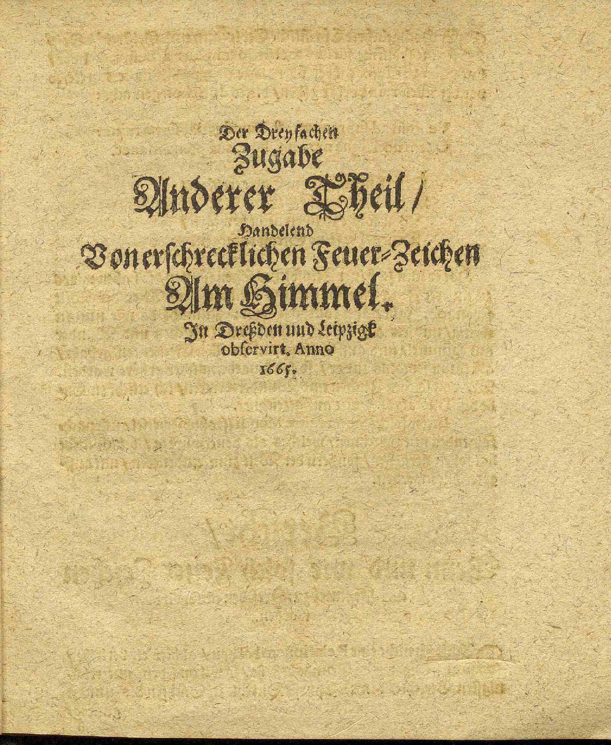 Dreyfache Zugabe Der Admirabilium In Aere Et Æthere Oder Wunderbaren Wercke Gottes : In der Lufft und am Gestirnten Himmel, So auff vorher erschienenen großen Cometen, sich noch ferner begeben, An Dreyen Sonnen und Regenbogen, An erschrecklichen Feuer-Zeichen, Und an einen Neuen Cometen, Welche anderweit vor- in- und nach denen Heiligen Oster-Feyertagen dieses 1665. Jahres observiret worden / von Churfl. Durchl. zu Sachsen bestalten Kunst-Kämmerer in Dreßden, Tobias Beuteln