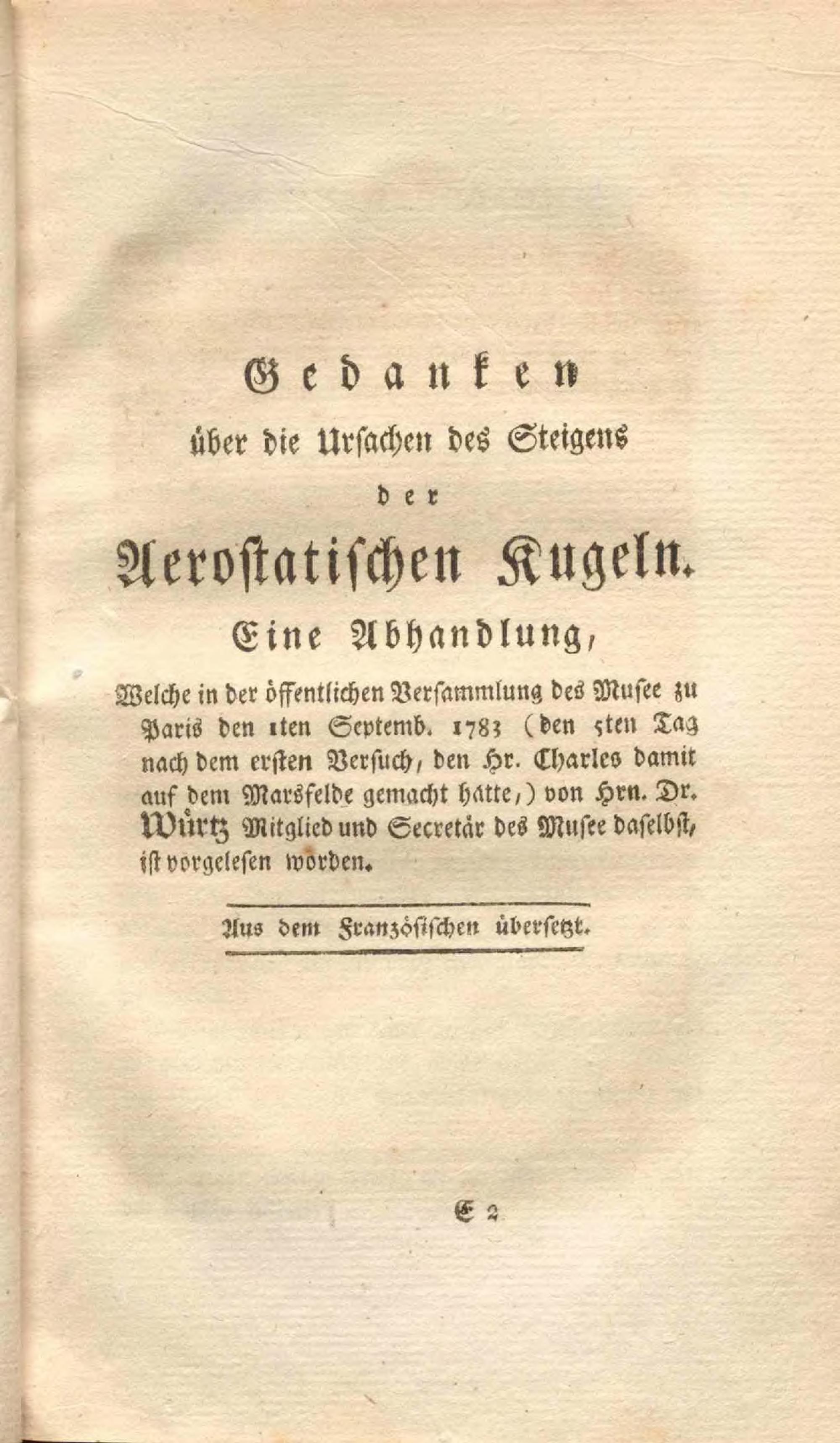 Montgolfier'sche Luftkörper oder Aerostatische Maschinen : eine Abhandlung, worinn die Kunst sie zu verfertigen und die Geschichte der bisher damit angestellten Versuche beschrieben werden ; Nebst einer Beschreibung der zwo ersten Reisen durch die Luft, und Hrn. D. Würtz Gedanken über die Ursachen des Steigens dieser Luftkugeln, welche er in dem Musee zu Paris den I. Sept. 1783 vorgelesen hat / von Friedrich Ludwig Ehrmann, J.U.L.