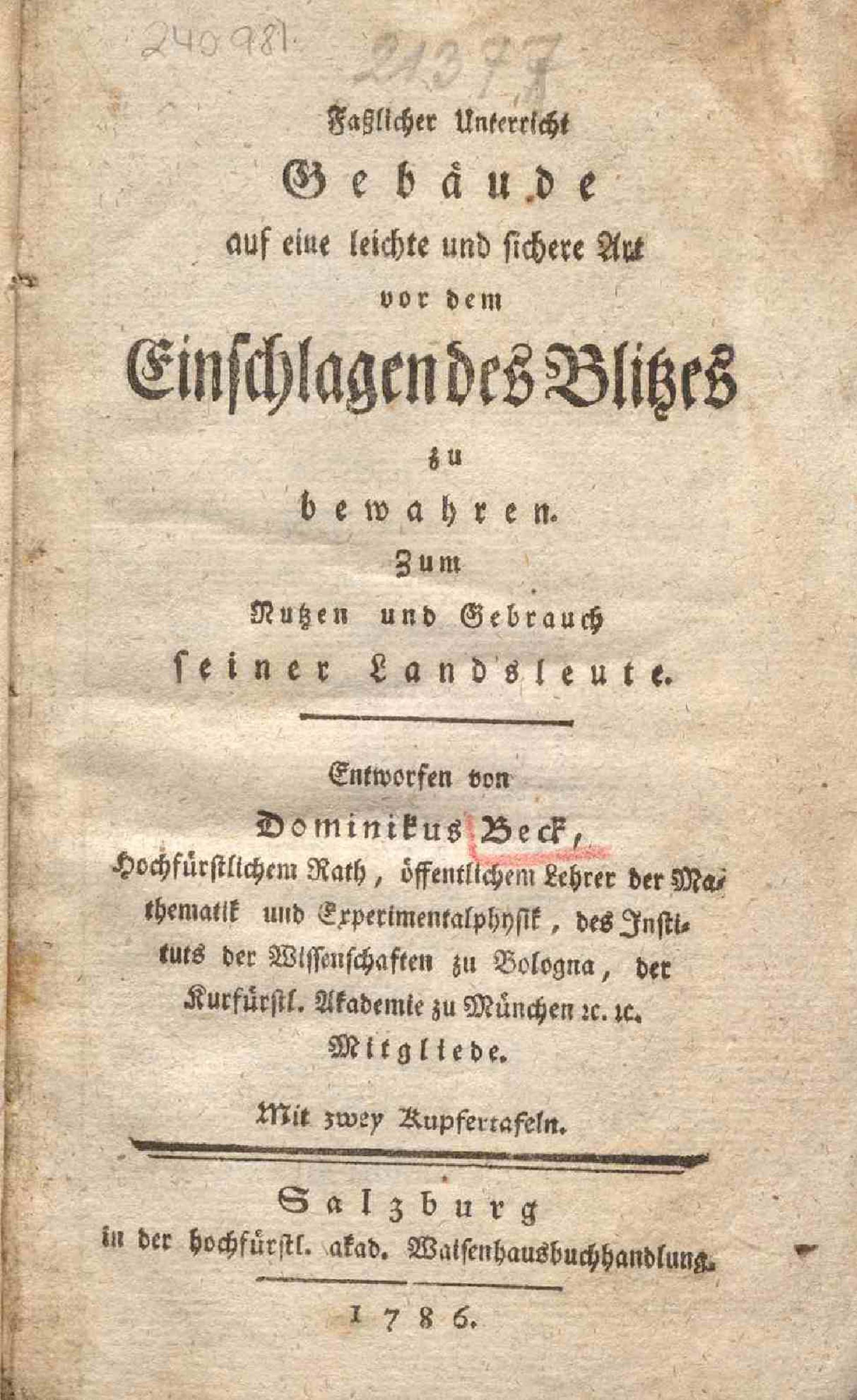 Faßlicher Unterricht Gebäude auf eine leichte und sichere Art vor dem Einschlagen des Blitzes zu bewahren : Zum Nutzen und Gebrauch seiner Landsleute / entworfen von Dominikus Beck