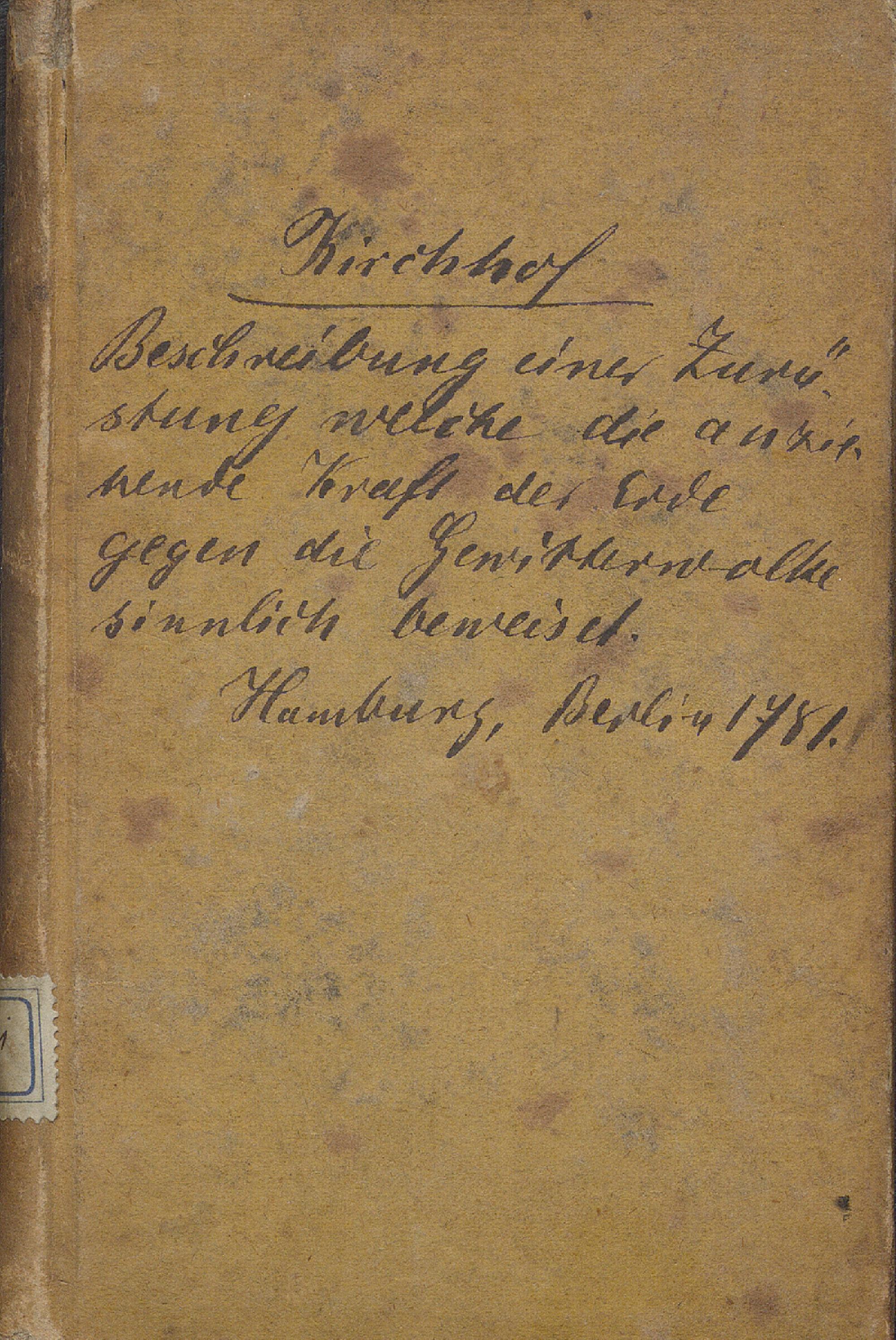 N. A. J. Kirchhofs Beschreibung einer Zurüstung welche die anziehende Kraft der Erde gegen die Gewitterwolke und die Nützlichkeit der Blitzableiter sinnlich beweiset : nebst einer Kupfertafel und einer Beschreibung verschiedener nützlichen Maschinen, aus Herrn Fergusons Vorlesungen übersetzt