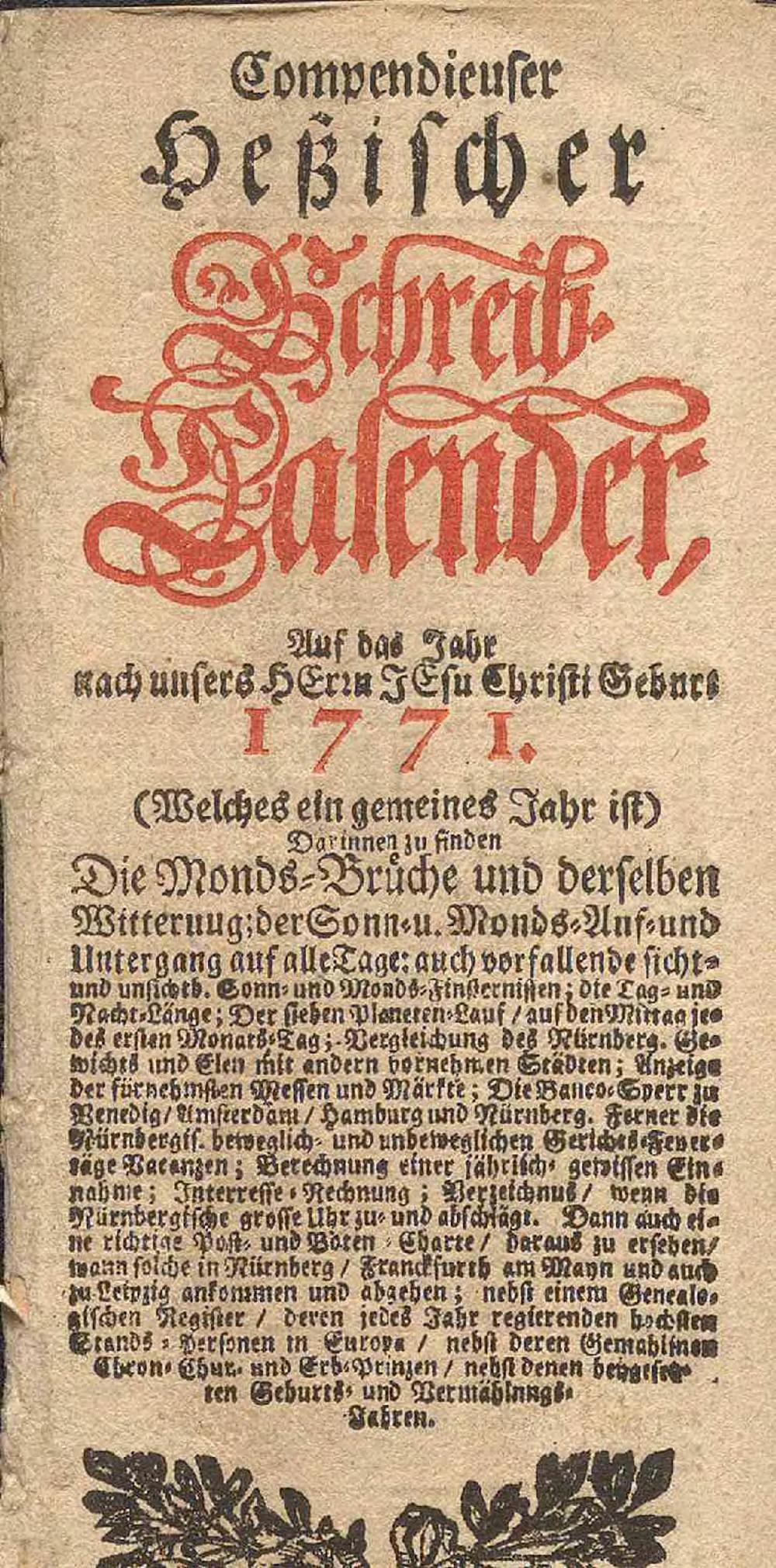 Compendieuser Heßischer Schreib-Kalender Auf das Jahr nach unsers Herrn Jesu Christi Geburt 1771 (Welches ein gemeines Jahr ist) : Darinnen zu finden Die Monds-Brüche und derselben Witterung; der Sonn- u. Monds-Auf- und Untergang auf alle Tage: auch vorfallende sicht- und unsichtb. Sonn- und Monds-Finsternissen; die Tag- und Nacht-Länge; Der sieben Planeten-Lauf / auf den Mittag jedes ersten Monats-Tag; Vergleichung des Nürberg. Gewichts und Elen mit andern vornehmen Städten; Anzeige der fürnehmstern Messen und Märkte; Die Banco-Sperr zu Venedig/Amsterdam/Hamburg und Nürnberg ...