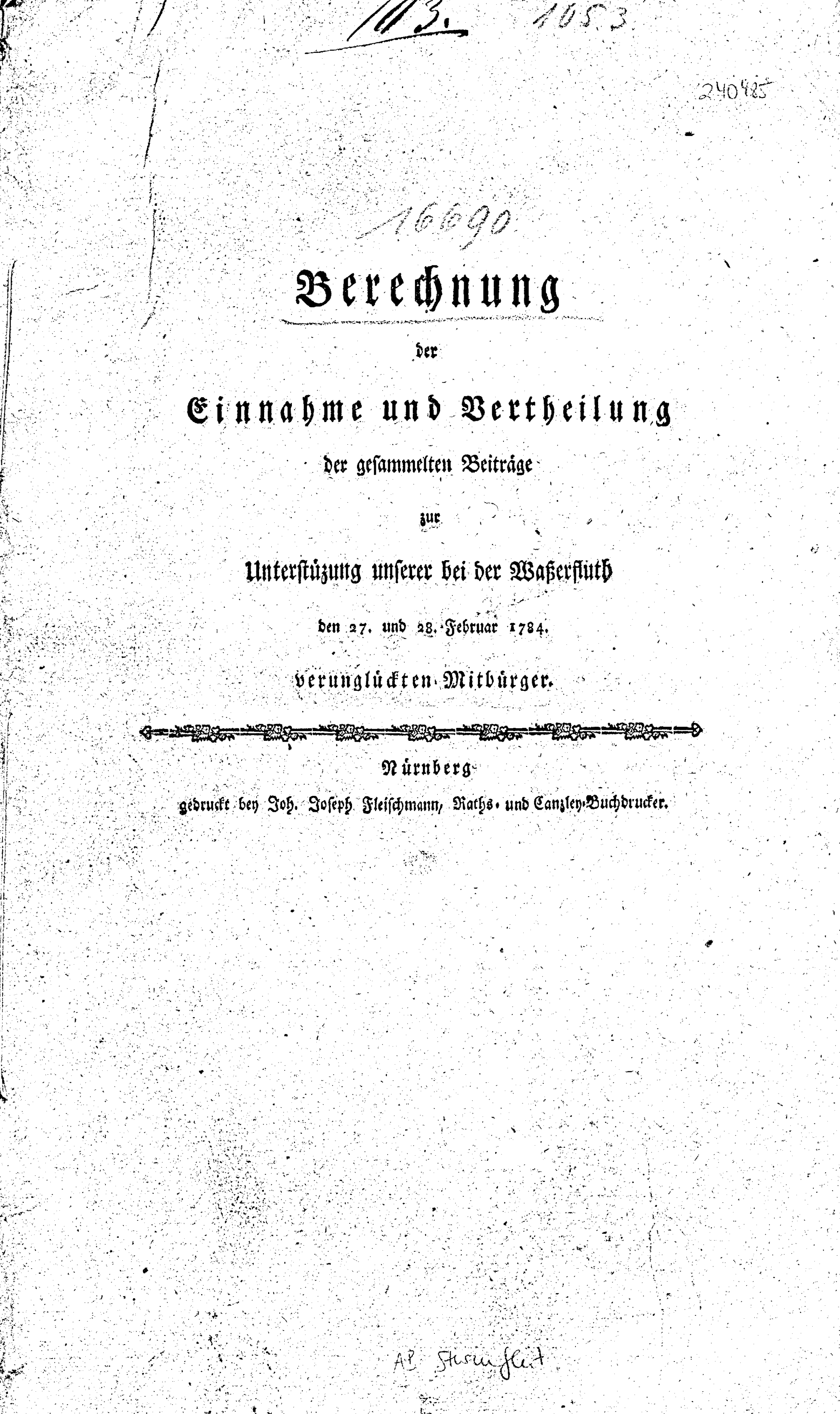 Berechnung der Einnahme und Vertheilung der gesammelten Beiträge zur Unterstüzung unserer bei der Waßerfluth den 27. und 28. Februar 1784. verunglückten Mitbürger