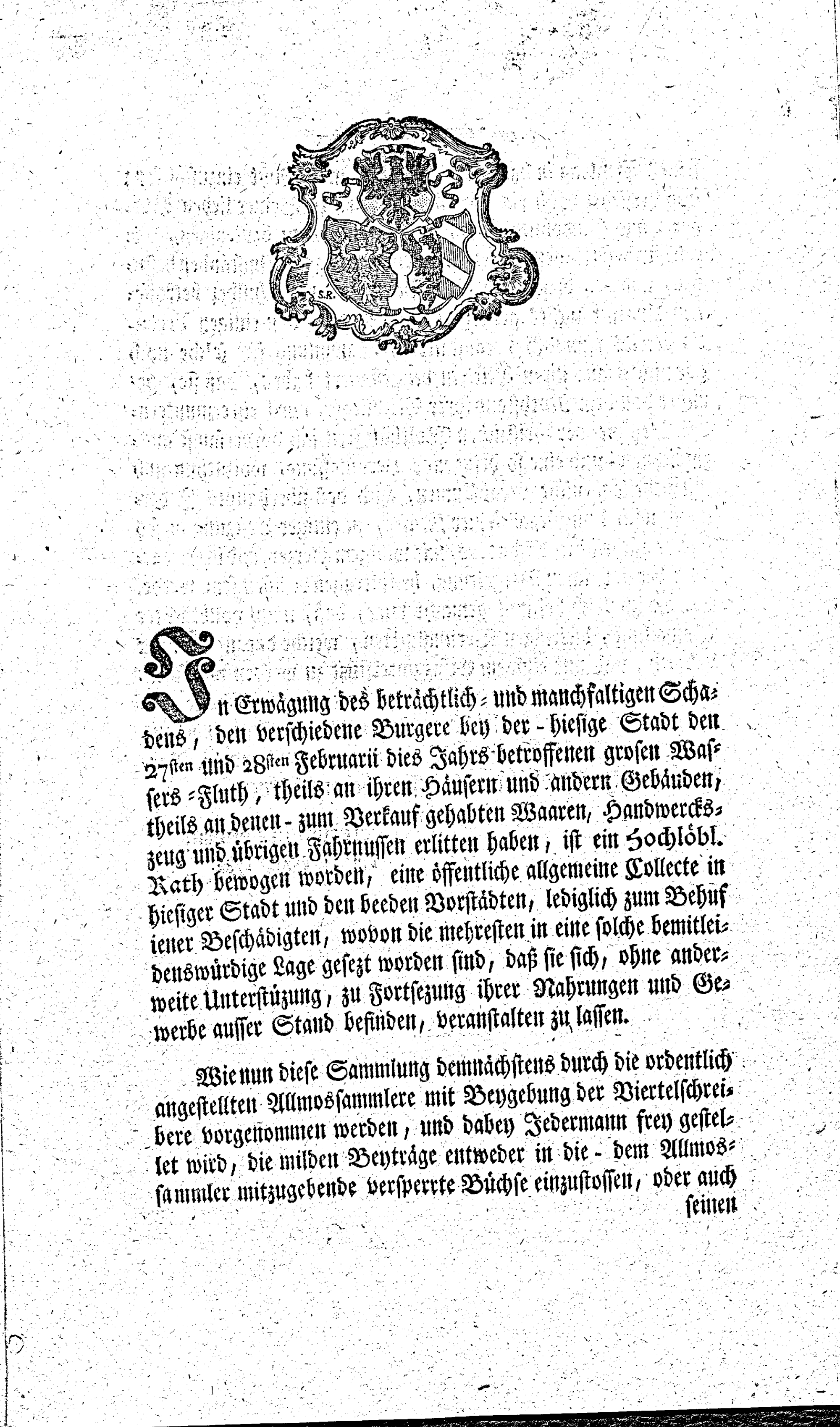 Berechnung der Einnahme und Vertheilung der gesammelten Beiträge zur Unterstüzung unserer bei der Waßerfluth den 27. und 28. Februar 1784. verunglückten Mitbürger