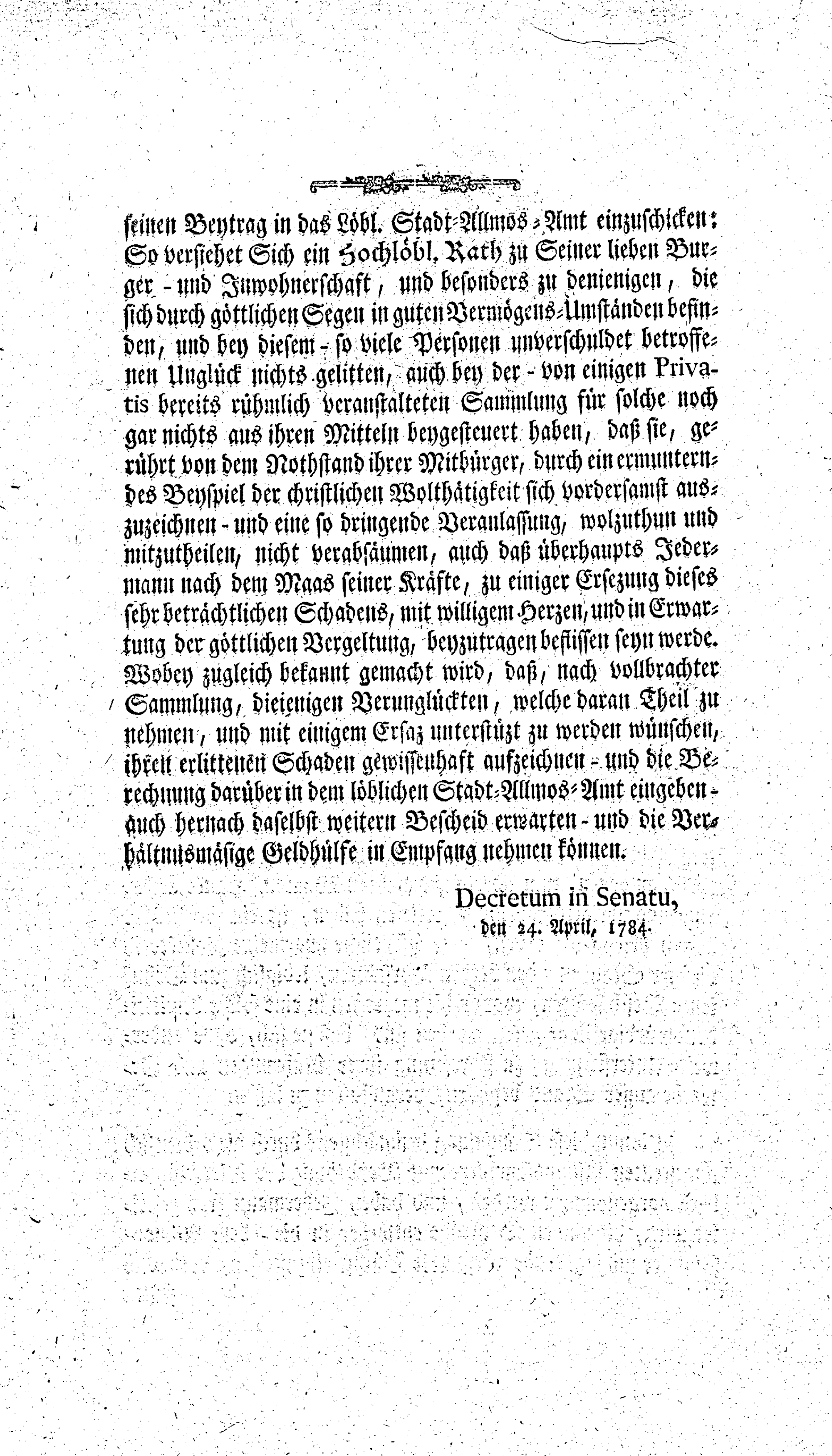 Berechnung der Einnahme und Vertheilung der gesammelten Beiträge zur Unterstüzung unserer bei der Waßerfluth den 27. und 28. Februar 1784. verunglückten Mitbürger
