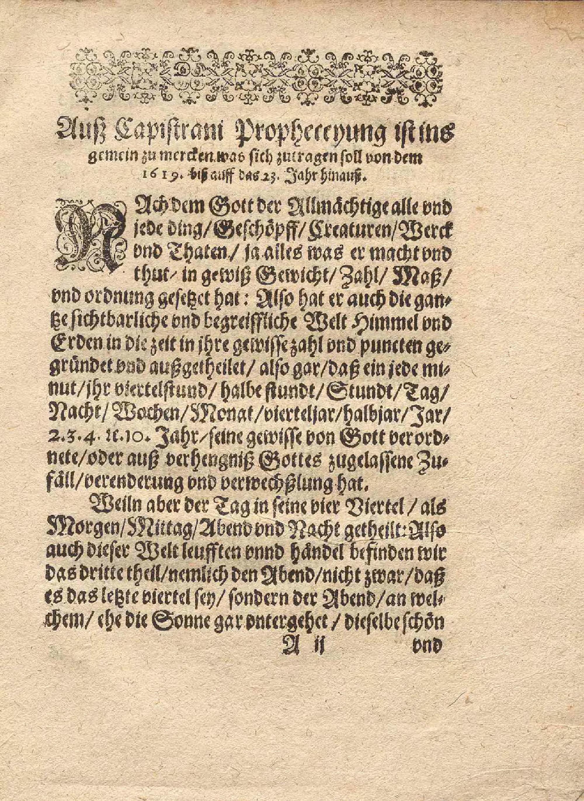 Woldenckwürdige Weissagung vnnd Propheceyung/ von den jetzigen Läufften/ vnnd sonderlich von dem noch innstehenden 1619. Vnnd nachfolgenden 1620. 1621. 1622. 1623. Jahren / Von Johanne Capistrano, einem Schlesier/ mit Prophetischen Gaben gezierten/ vnd damaln weitberühmbten Astronomo, Anno 1460. als vor 159. Jahren geweissaget/ vnd propheceyet