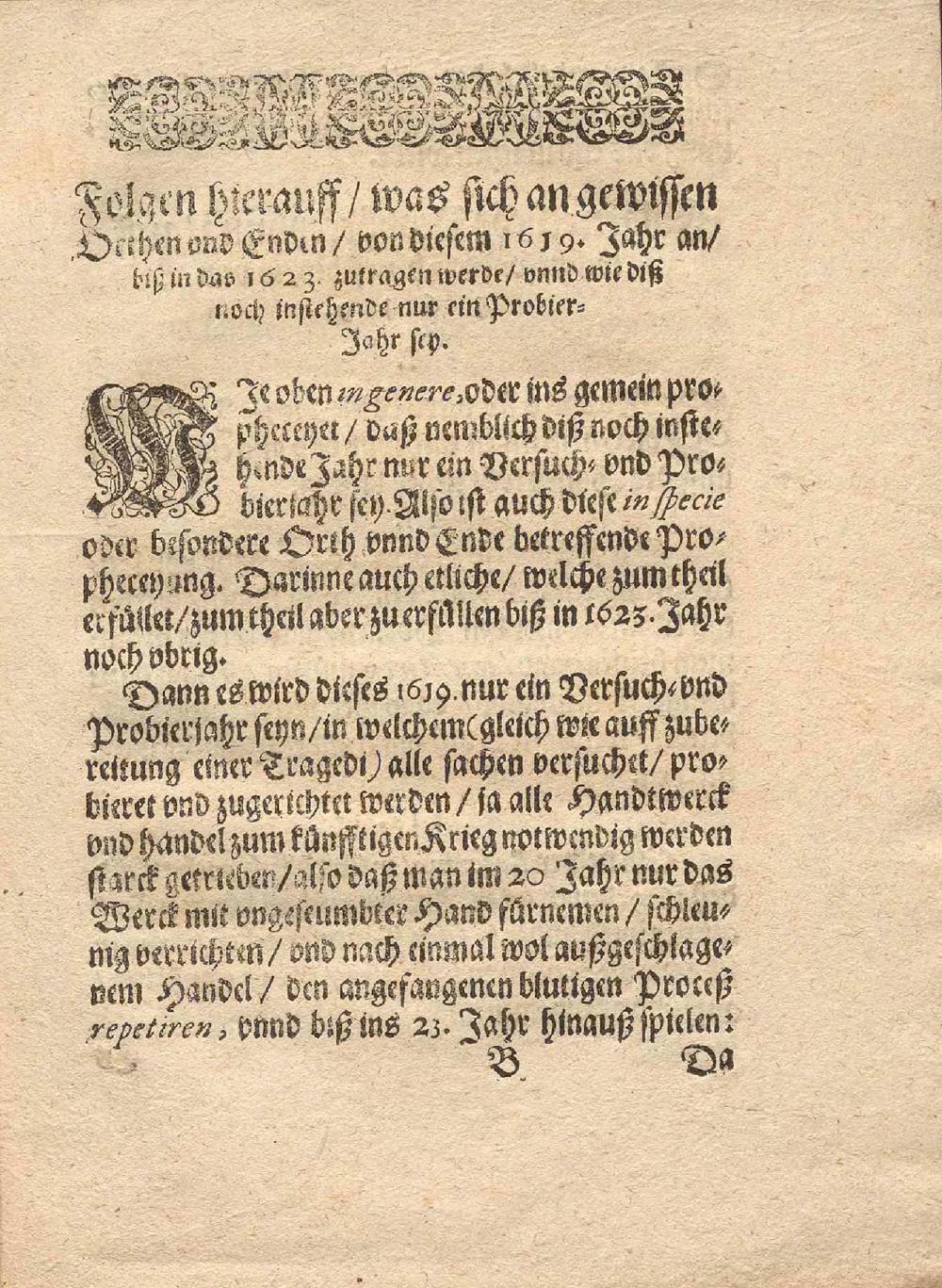 Woldenckwürdige Weissagung vnnd Propheceyung/ von den jetzigen Läufften/ vnnd sonderlich von dem noch innstehenden 1619. Vnnd nachfolgenden 1620. 1621. 1622. 1623. Jahren / Von Johanne Capistrano, einem Schlesier/ mit Prophetischen Gaben gezierten/ vnd damaln weitberühmbten Astronomo, Anno 1460. als vor 159. Jahren geweissaget/ vnd propheceyet