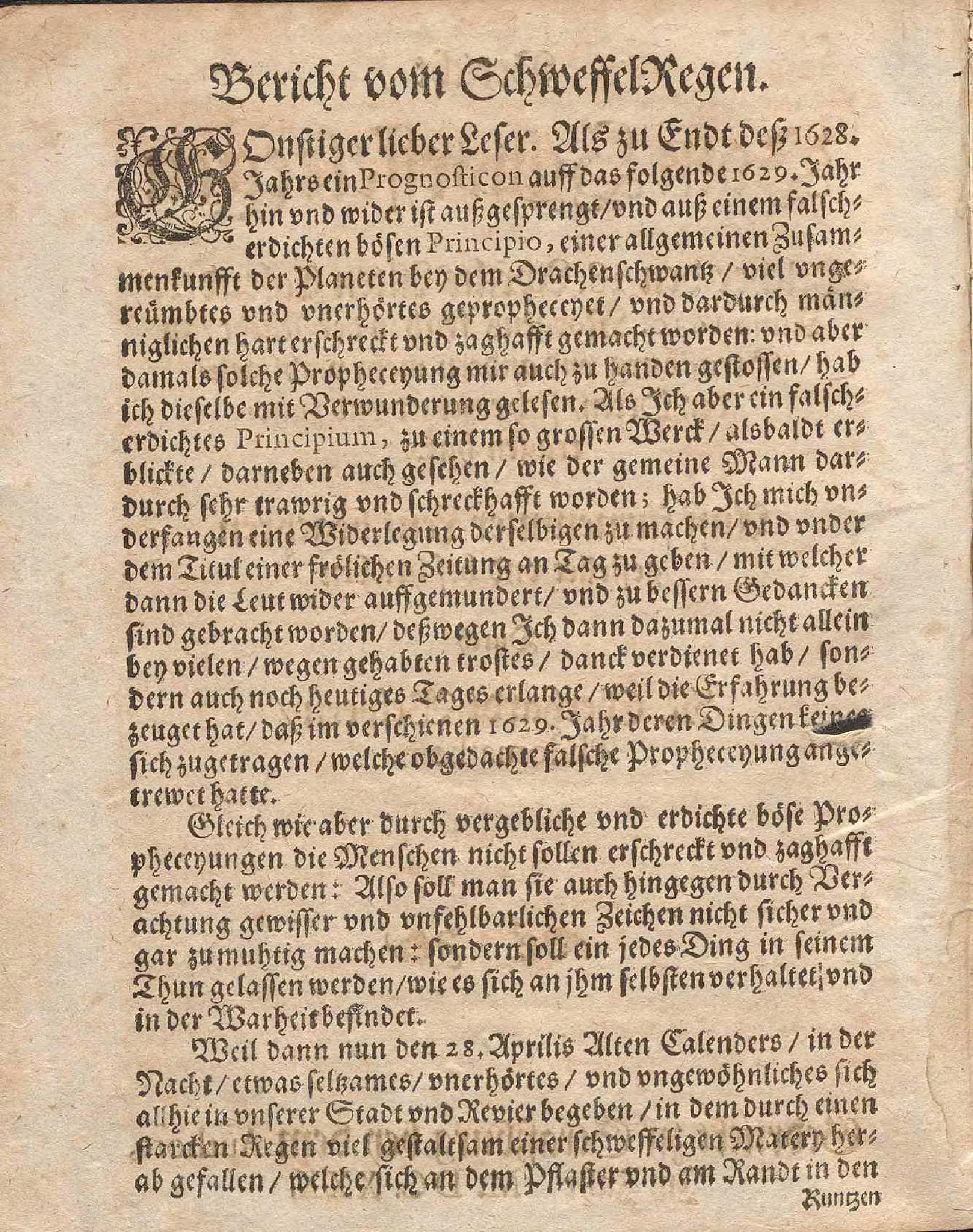 Bericht Vom Schweffelregen, Welcher den 28. Aprilis Alten Calenders/ Anno 1630. Morgens früh in der Nacht/ zu Straßburg vnd andern mehr vmbligenden Orten/ sich erzeiget vnd zugetragen hat : Auff fürnemmer Leut begehren gestellt vnd beschrieben / Durch Eberhardt Welpern/ Philomathem.